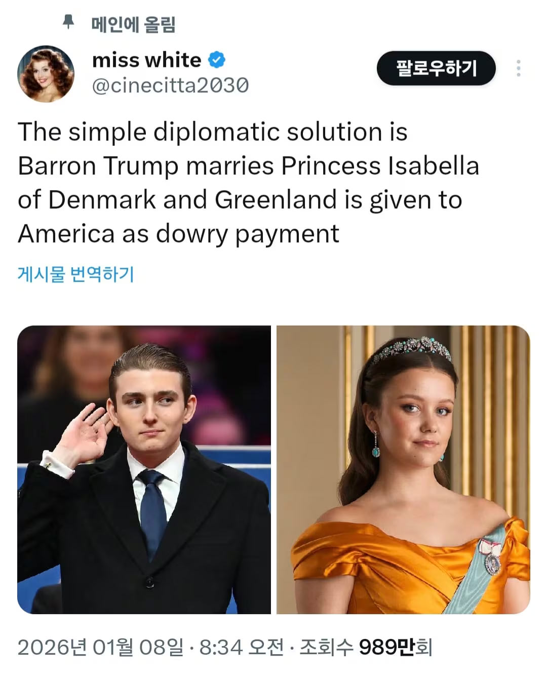 16日、ソーシャル・メディア(SNS)のX(旧ツイッター)で有名な政治風刺アカウント「ミス・ホワイト」によると、トランプ大統領の末息子バロン氏(19)とデンマークのイザベラ王女(18)を政略結婚させ、グリーンランド問題を解決しようとの提案がなされた。