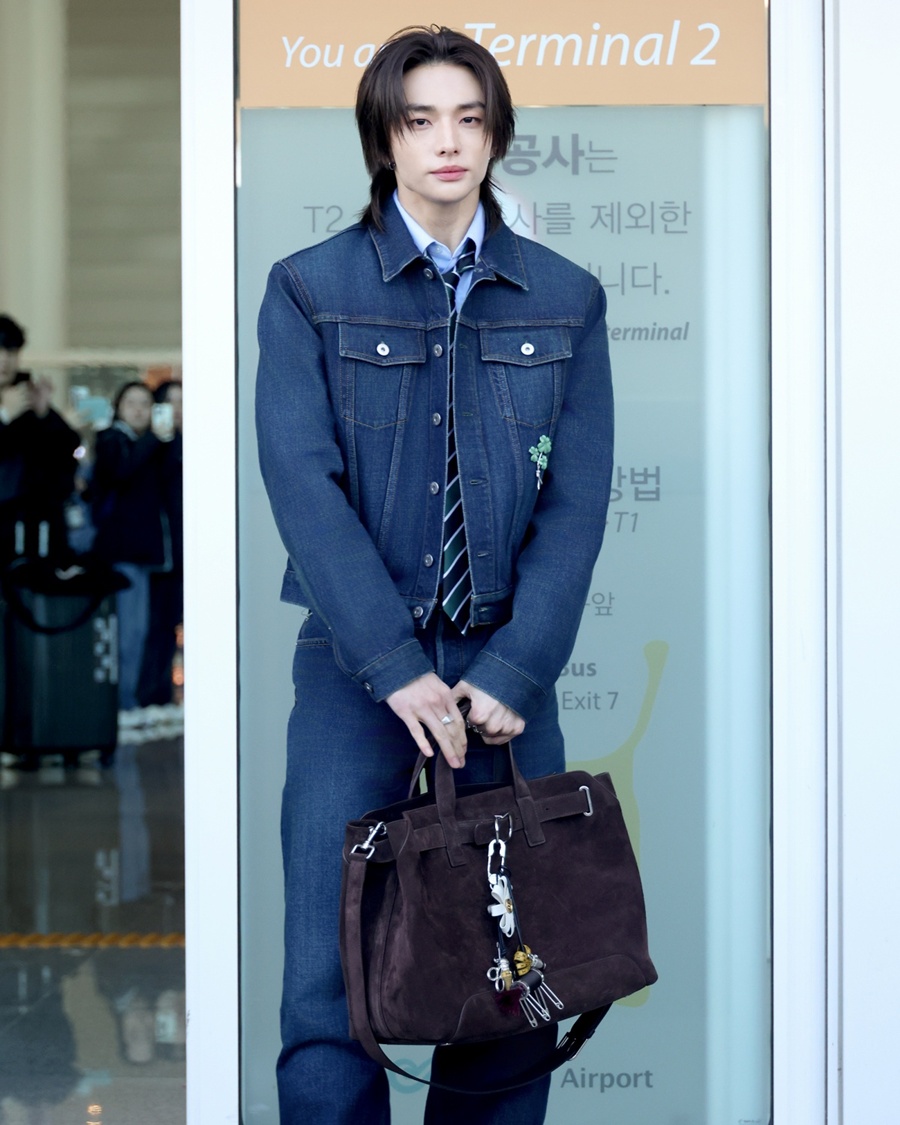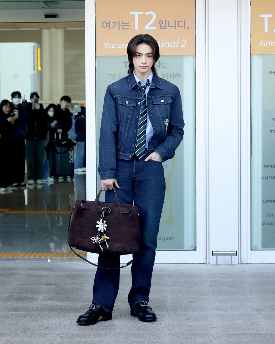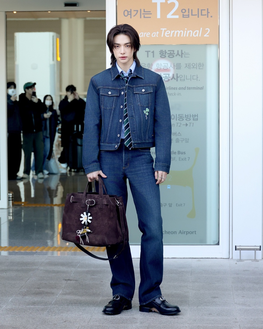 この日、別格のシックなビジュアルで空港に現れ、現場にいた大勢の人々の視線を引き付けたヒョンジン。カジュアルなデニム上下のスタイルにクラシカルなタイを合わせたセンスあるフライトコーデで、モダンなムードのスタイリングを完成させた。