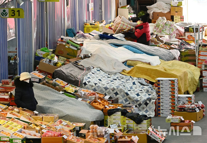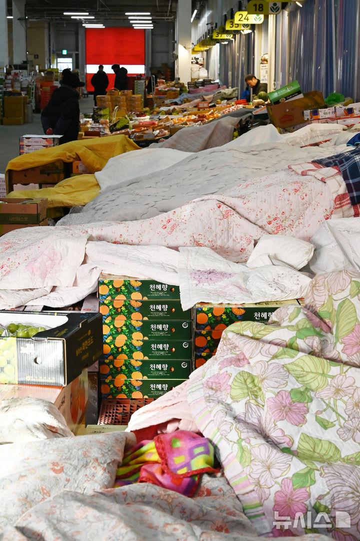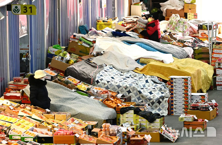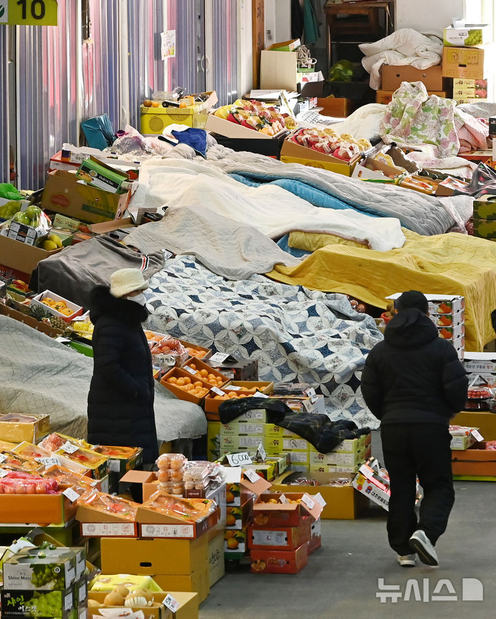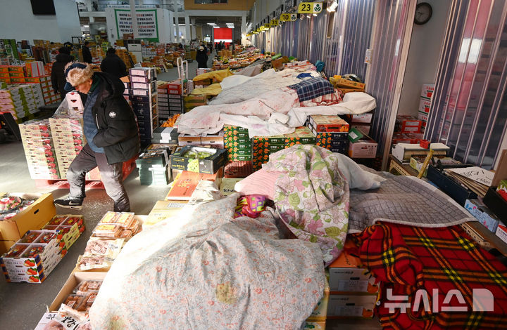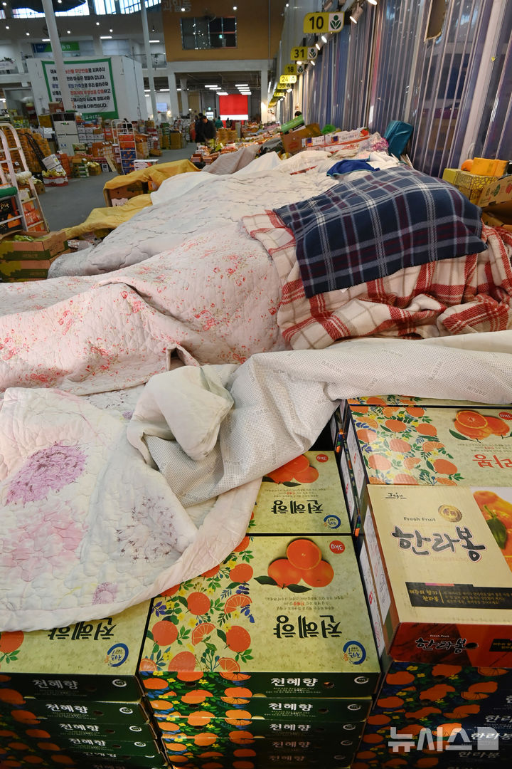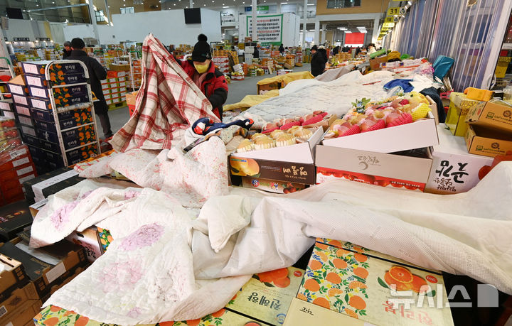 【NEWSIS】韓国各地で非常に強い寒さが続いている21日、京畿道水原市勧善区にある水原農水産物卸売市場の果実棟では、凍結による破損を防止するため保温用毛布がかけられていた。