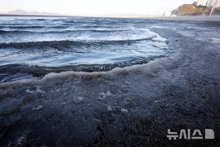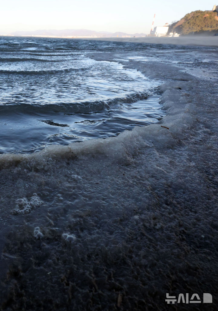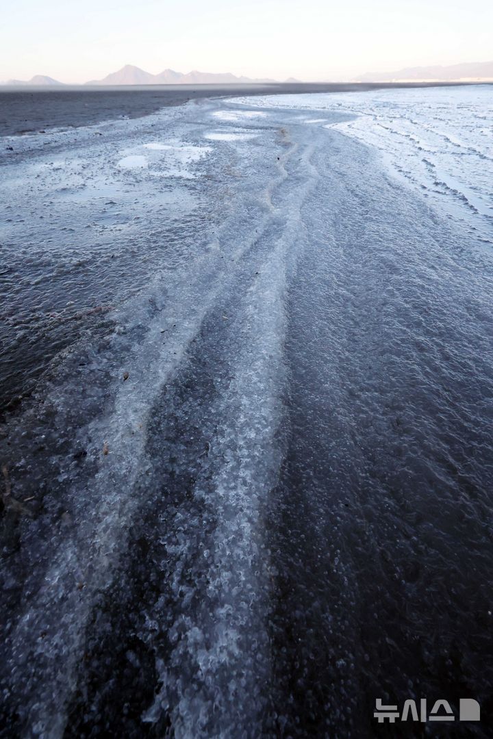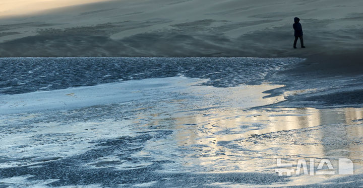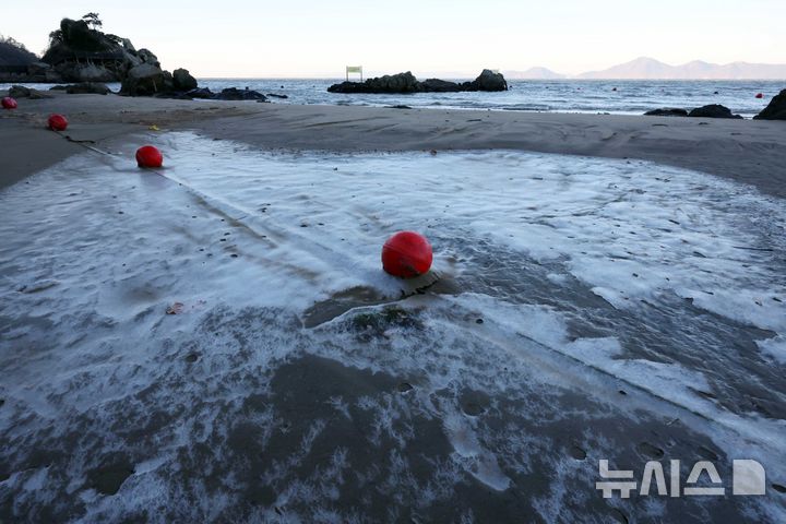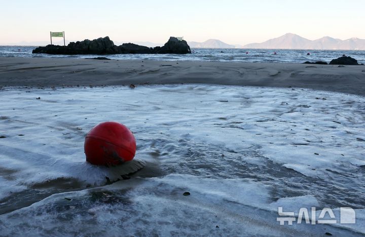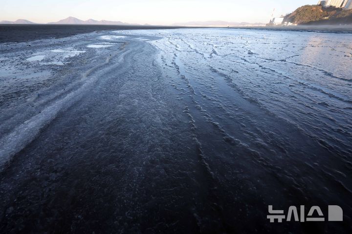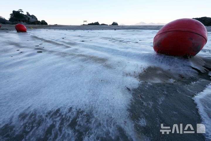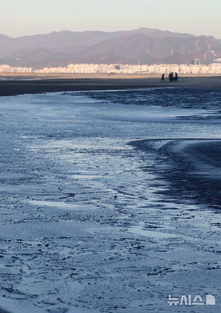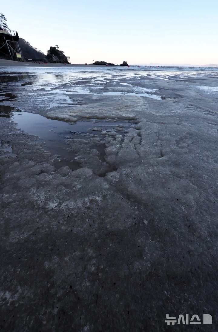 【NEWSIS】韓国各地を寒波が覆った21日、釜山市沙下区の多大浦海水浴場では、砂浜の一角で海水が凍り付いていた。