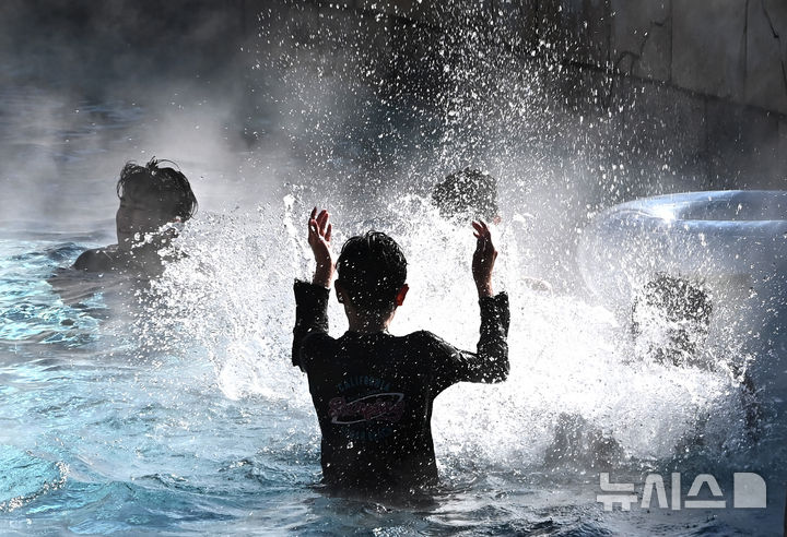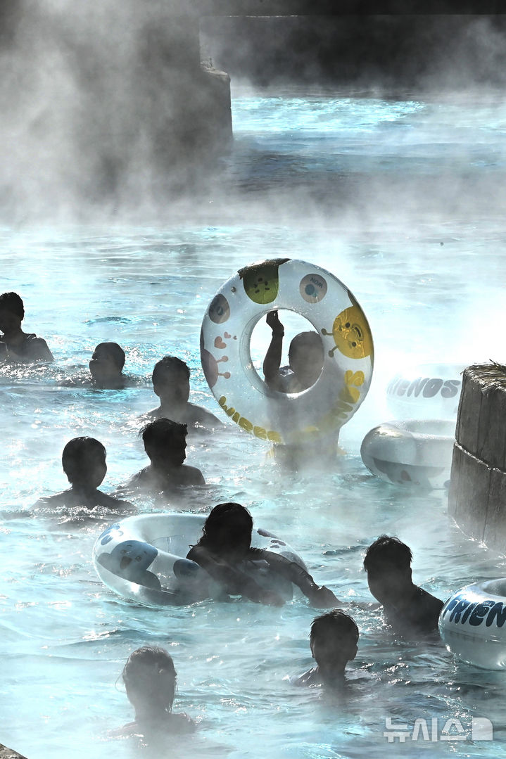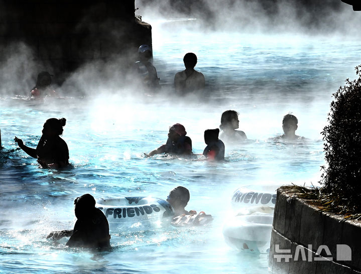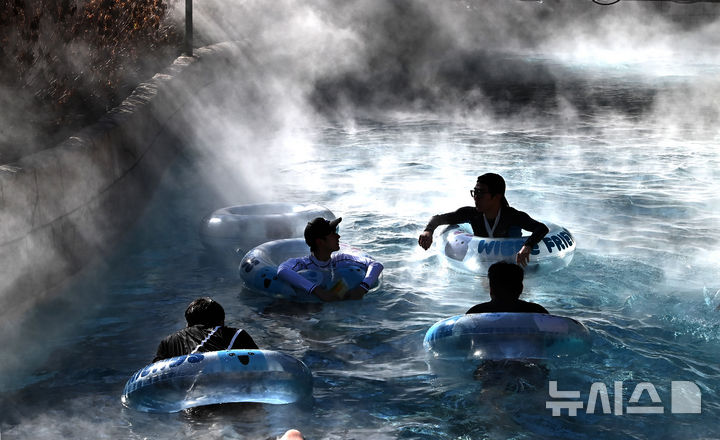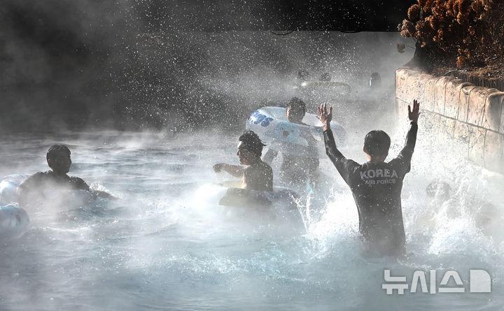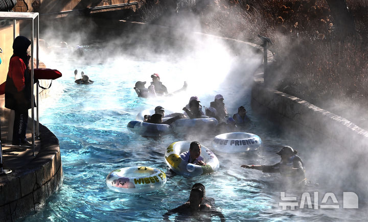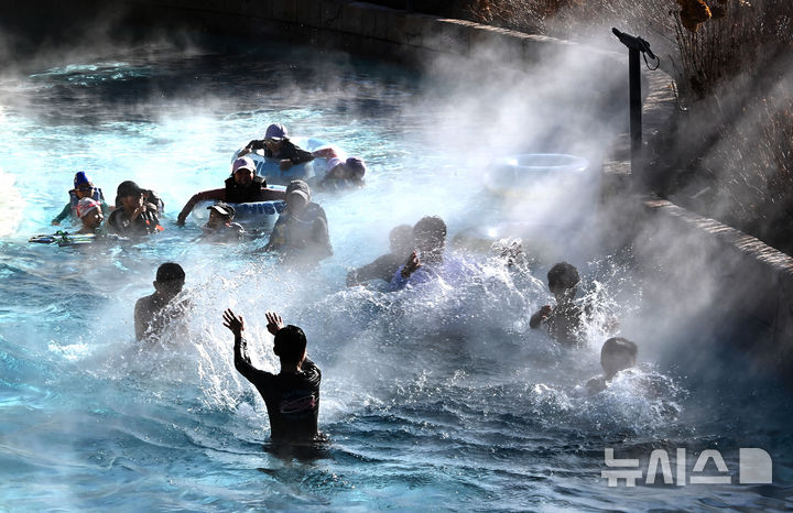 【NEWSIS】全国的に厳しい寒さが続いている22日、京畿道竜仁市のカリビアンベイを訪れた市民が、湯気の立ち昇る屋外の「流れるプール」で楽しいひとときを過ごしている様子。
