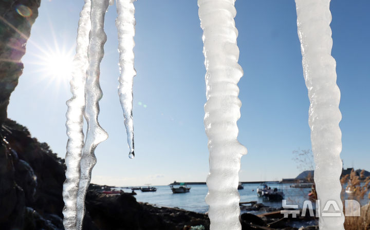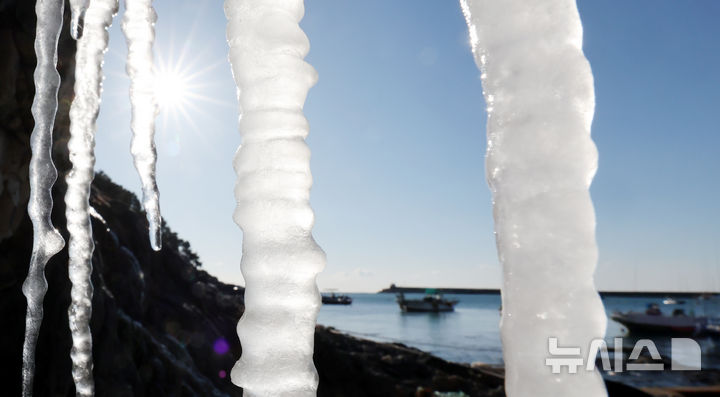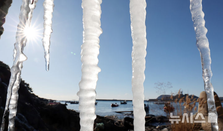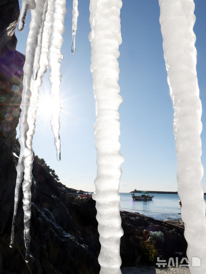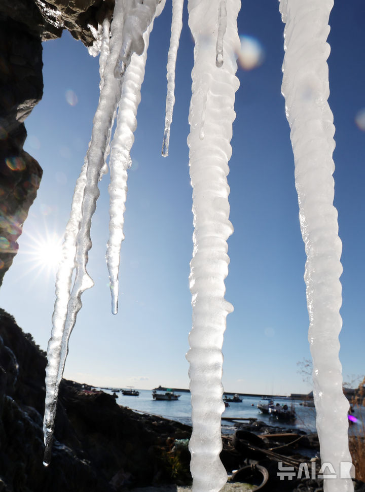 【NEWSIS】韓国各地で厳しい寒さとなった22日、釜山市南区白雲浦の磯に垂れ下がる「つらら」の様子。