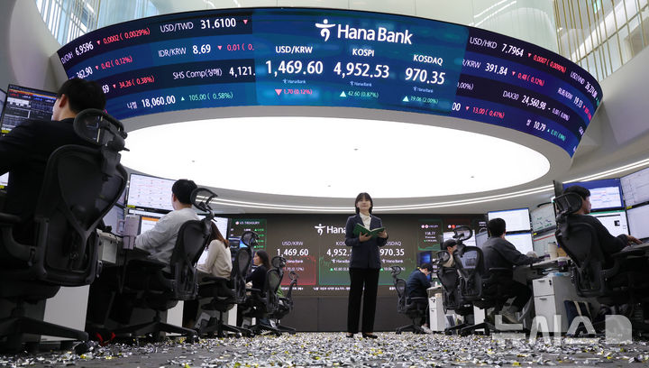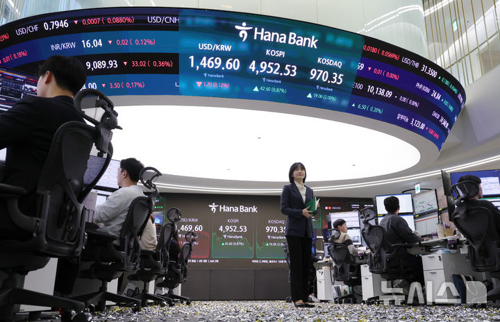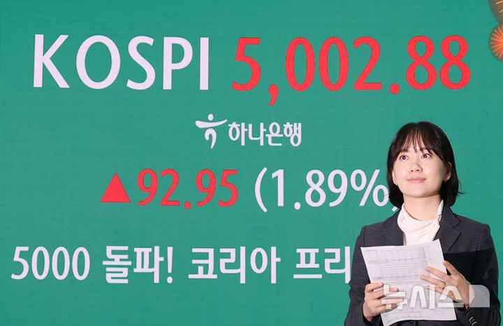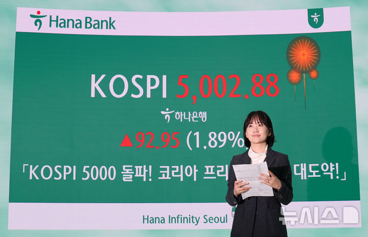 【NEWSIS】韓国総合株価指数(KOSPI)が取引中に一時5019.54まで上昇した22日、ソウル市中区にあるハナ銀行ディーリングルームの電光掲示板に、KOSPI5000突破を祝う画面が表示されている様子。