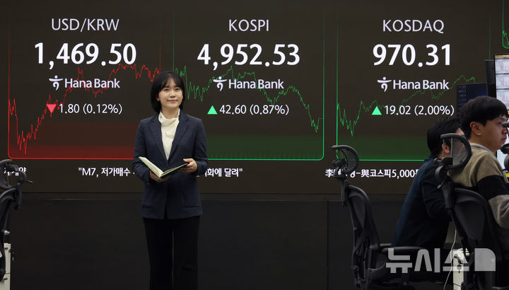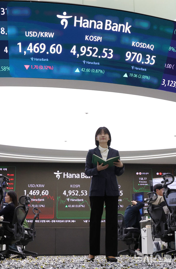 KOSPIは前取引日(4909.93)より42.60ポイント(0.87%)高い4952.53、KOSDAQ指数は前取引日(951.29)より19.06ポイント(2.00%)高い970.35で取引を終えた。