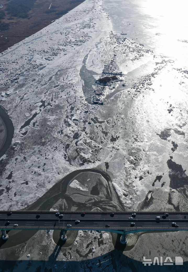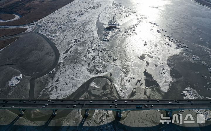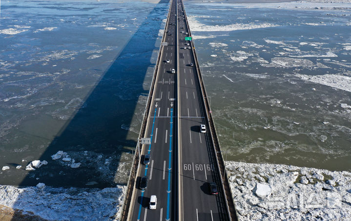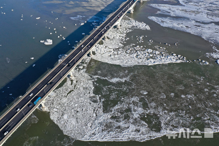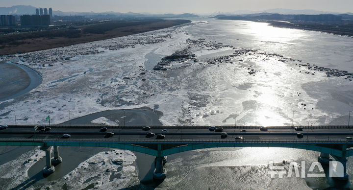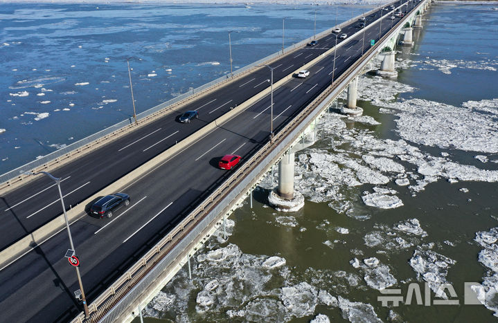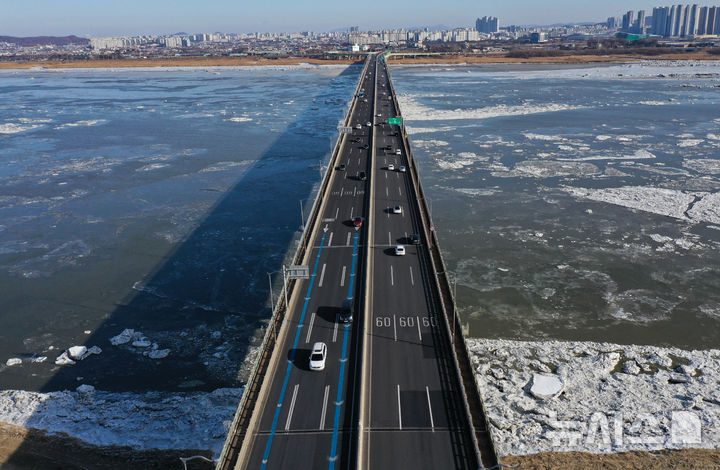 【NEWSIS】連日寒波が続く25日、京畿道金浦市にある一山大橋一帯の漢江を漂う氷。