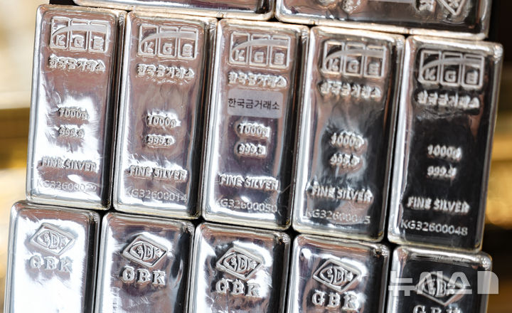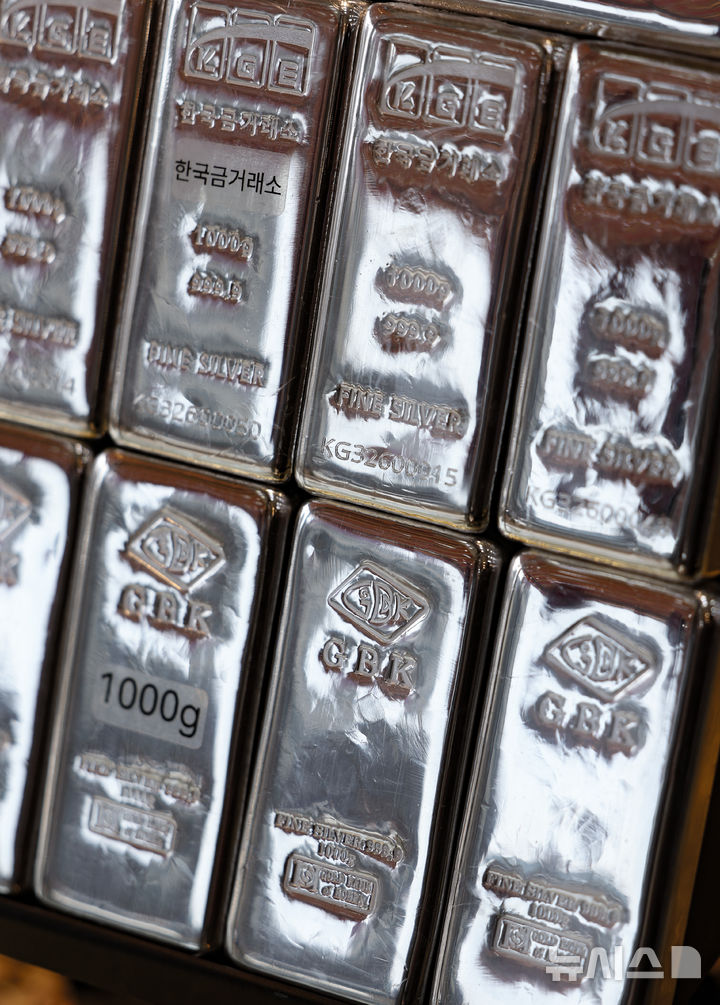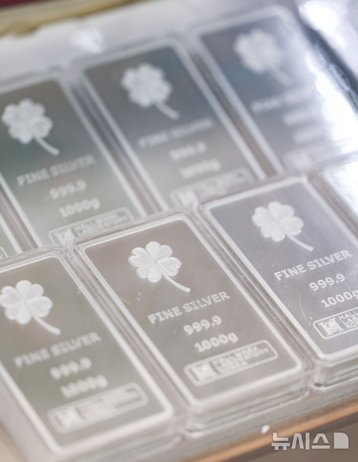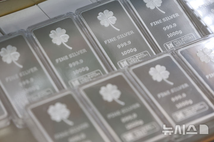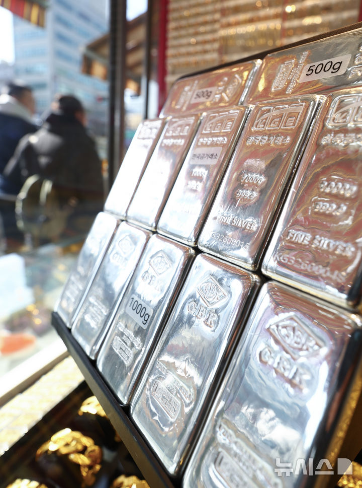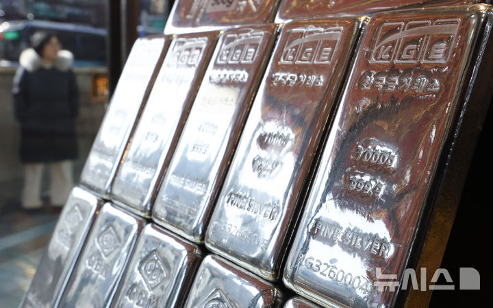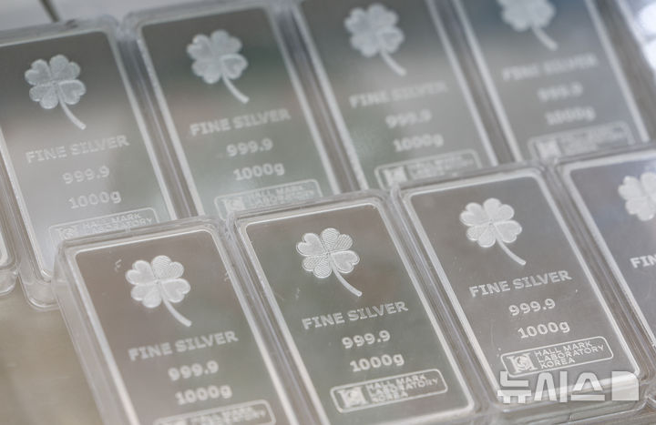 【NEWSIS】25日、ソウル市内のある貴金属店街に陳列されているシルバーバー(インゴット)。銀の価格は23日、先物・現物ともに史上初めて1オンス(約31.1g)当たり100ドルを突破した。