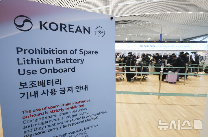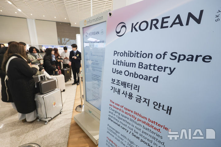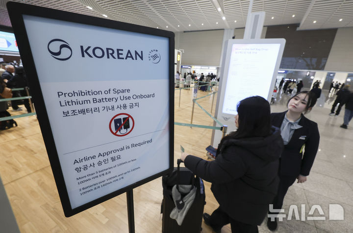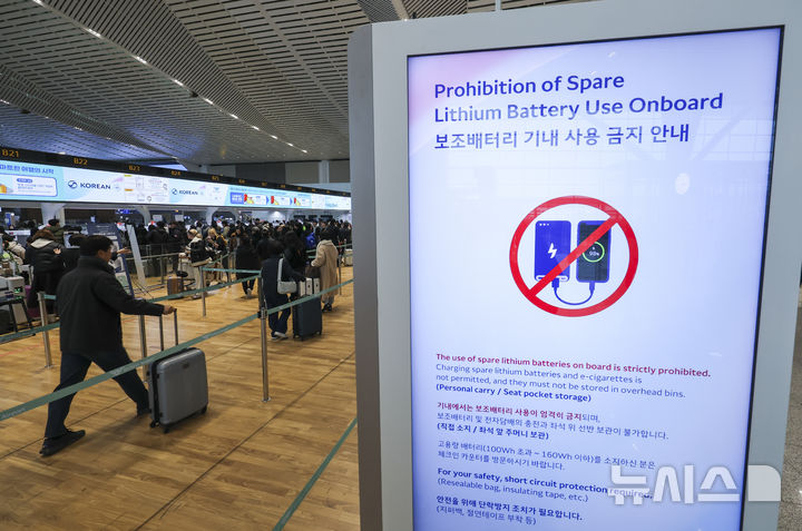 【NEWSIS】大韓航空をはじめとする韓進グループの航空会社5社がモバイルバッテリーの機内使用を全面禁止した。写真は禁止初日の26日、仁川市中区の仁川国際空港国際線出国ロビーに掲示されたモバイルバッテリー機内使用禁止の案内文。