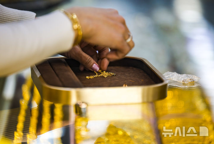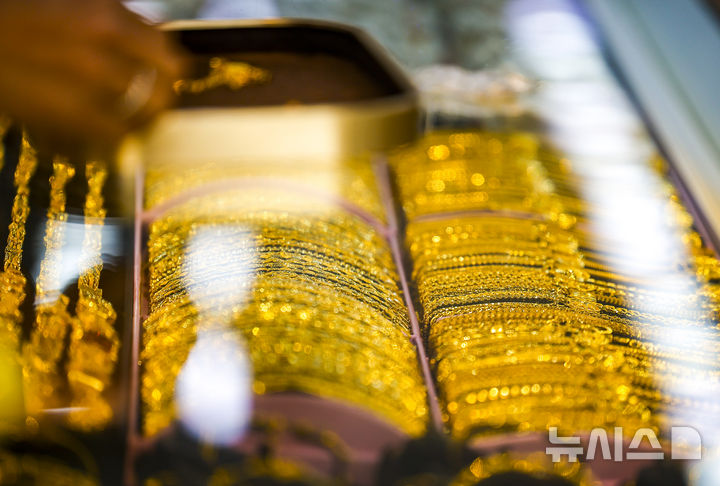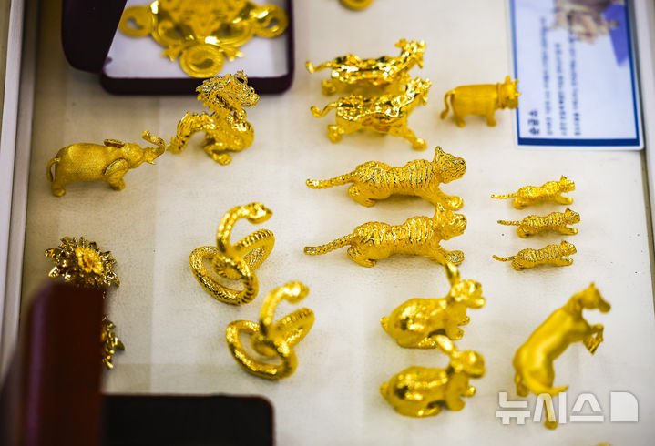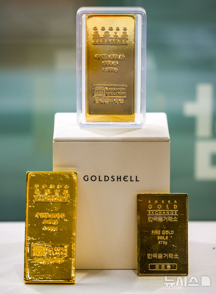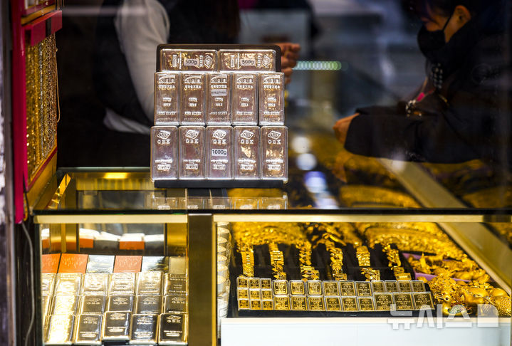【NEWSIS】26日、ソウル市内の貴金属店にゴールドバーが陳列してある様子。金価格が史上初めて1オンスあたり5000ドル(現在のレートで約76万9800円)を突破した。金価格は年明け以降、15%も上がり、1年で累積79%も高騰した。安全資産とされる金の価格は、地政学的な緊張構造やドル資産回避などの余波で上昇が続いている。