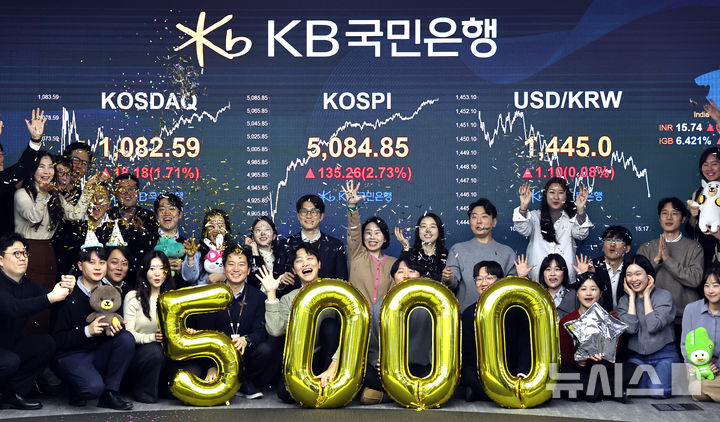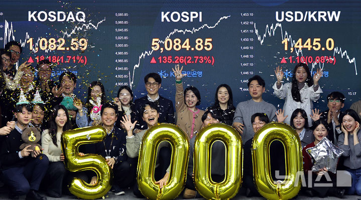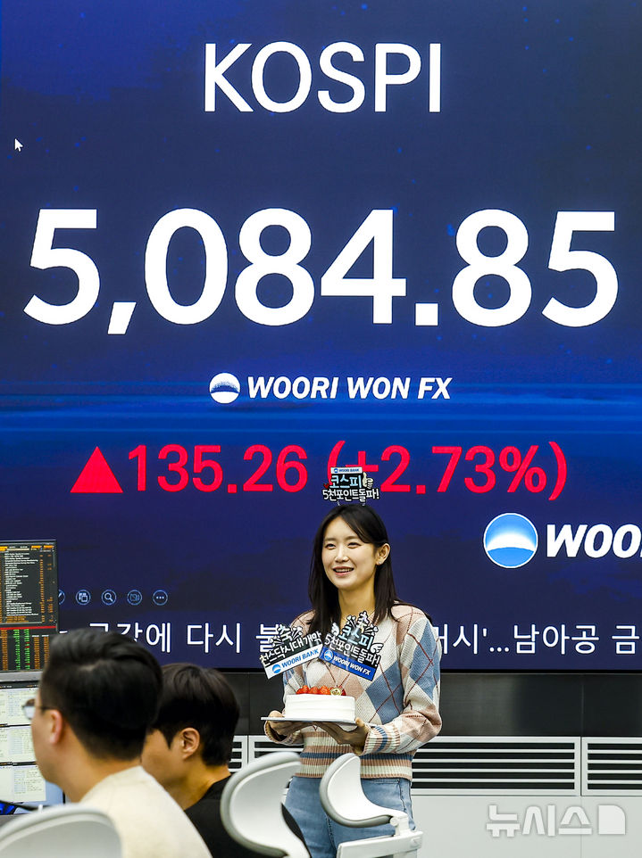 【NEWSIS】韓国総合株価指数(KOSPI)が終値基準で史上初めて5000のラインを突破した27日、ソウル市中区のウリ銀行本店ディーリングルームでお祝いをしている行員たちの様子。