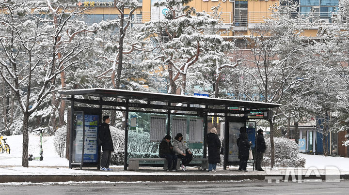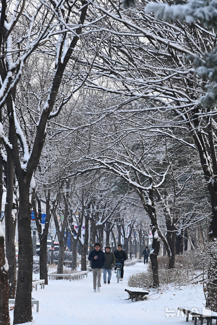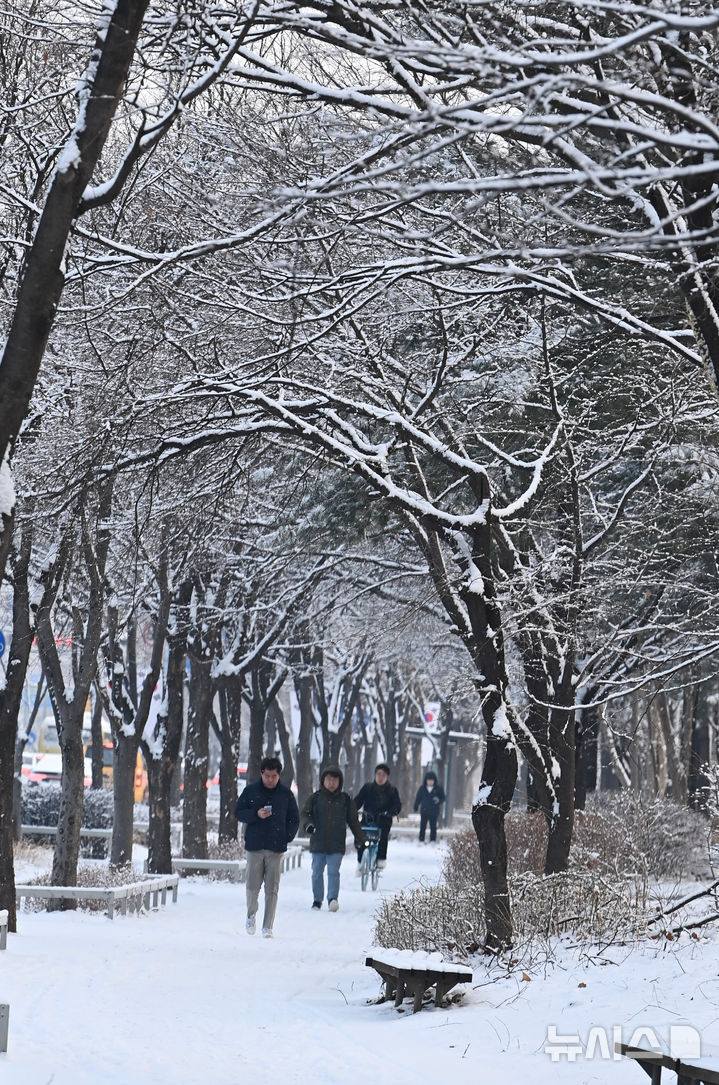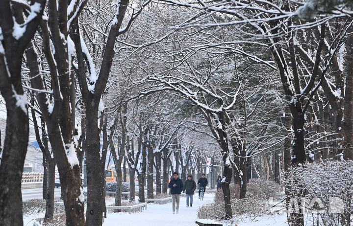 【NEWSIS】一晩中雪が降った2日、京畿道水原市霊通区梅灘洞で、雪が積もった道を歩いて出勤する人々。