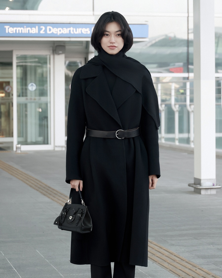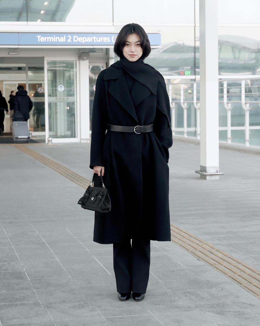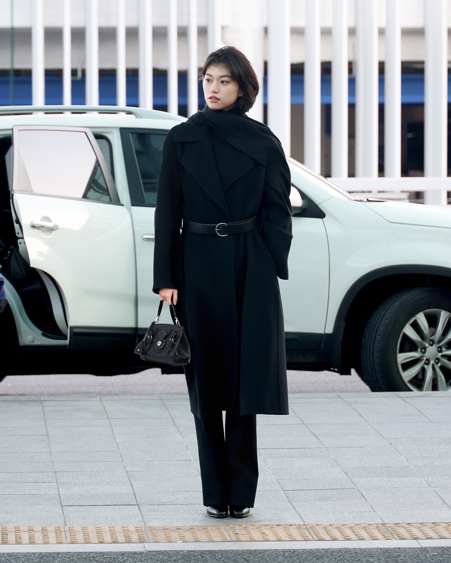 キム・ドヨンはこの日、クラシカルなシルエットとカシミア素材のラップコートを選択し、落ち着いていて洗練されたムードを完成させた。