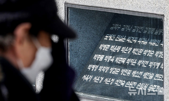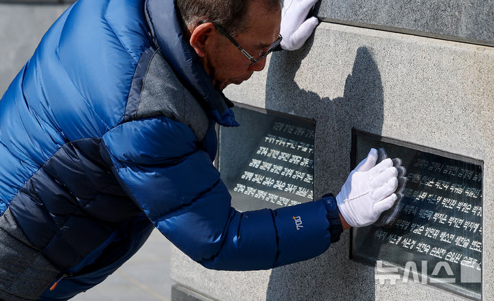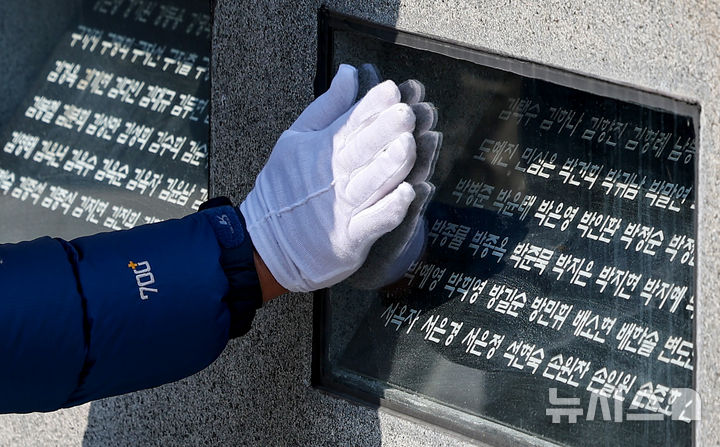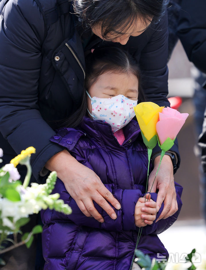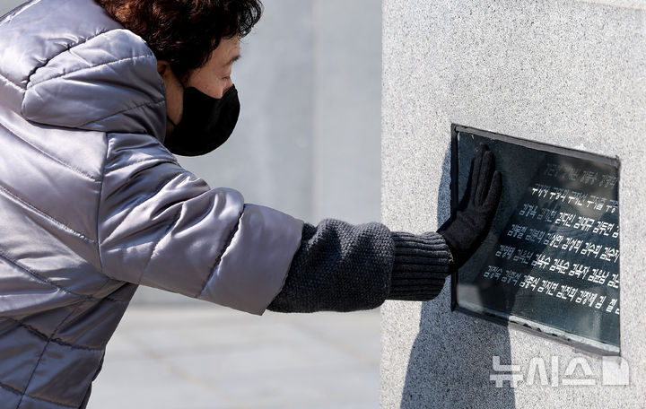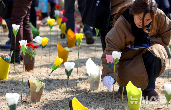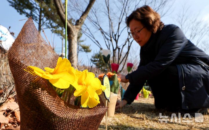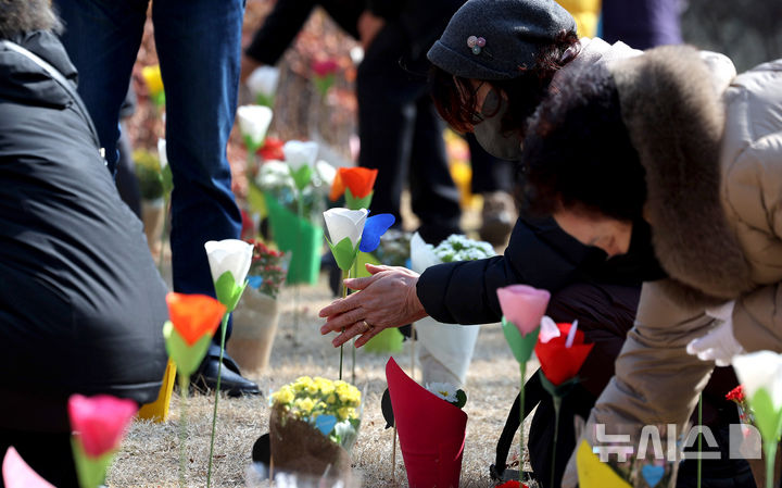 【NEWSIS】18日、大邱市東区の市民安全テーマパークで開かれた「大邱地下鉄火災惨事23周忌追慕式」を訪れた遺族が、追悼の花畑に花を立てているところ。