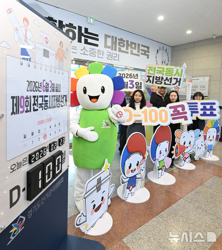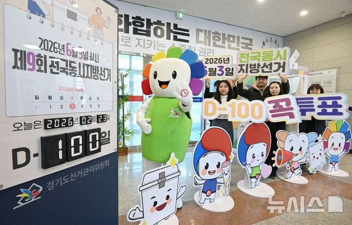 【NEWSIS】韓国の第9回全国同時地方選挙まであと100日に迫った23日、京畿道水原市霊通区の京畿道選挙管理委員会で、選管職員が「D-100日」カウントダウン広報パフォーマンスをしている様子。