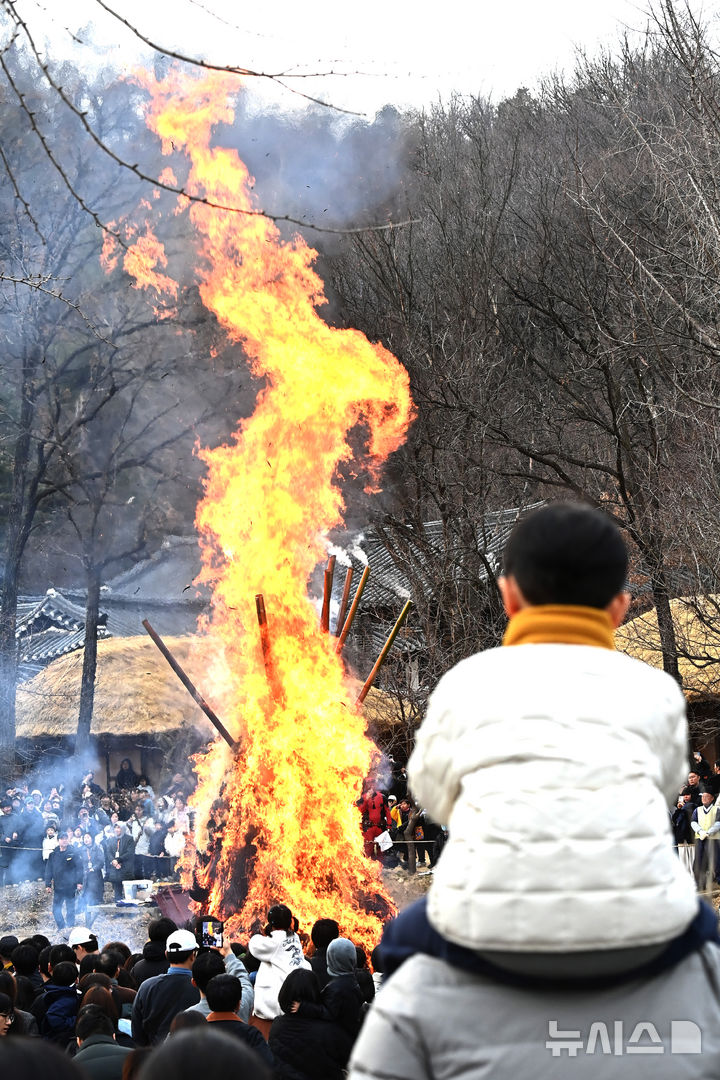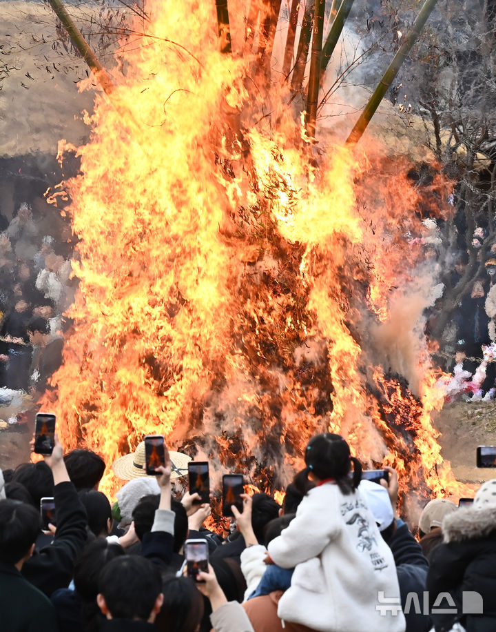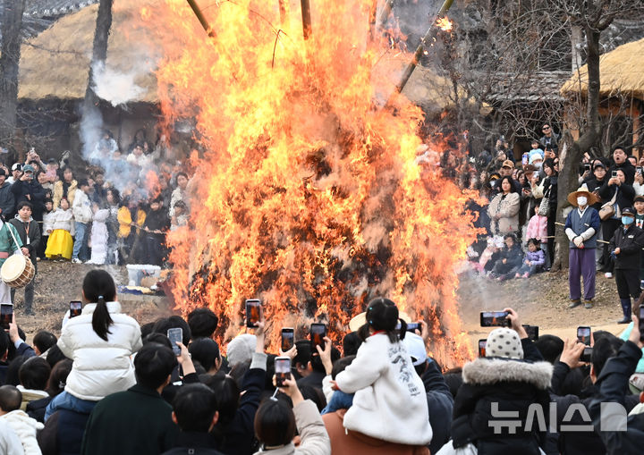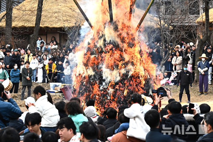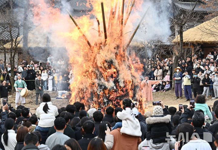 【NEWSIS】小正月(旧暦1月15日、今年は3月3日)まであと二日となった1日、京畿道竜仁市の韓国民俗村で「タルチプ焼き」が行われた。写真は燃え上がる炎を見つめ、五穀豊穣と無事安寧を祈る人々。タルチプ焼きは日本の「どんど焼き」に当たる行事だ。
