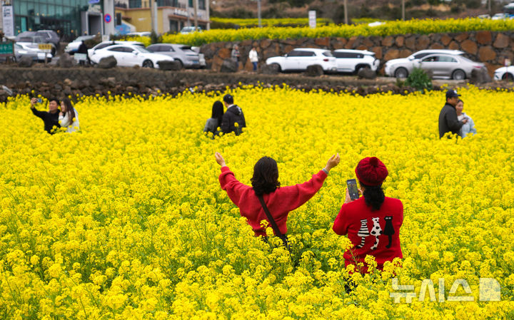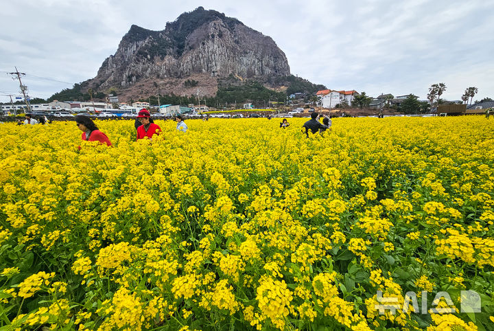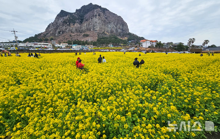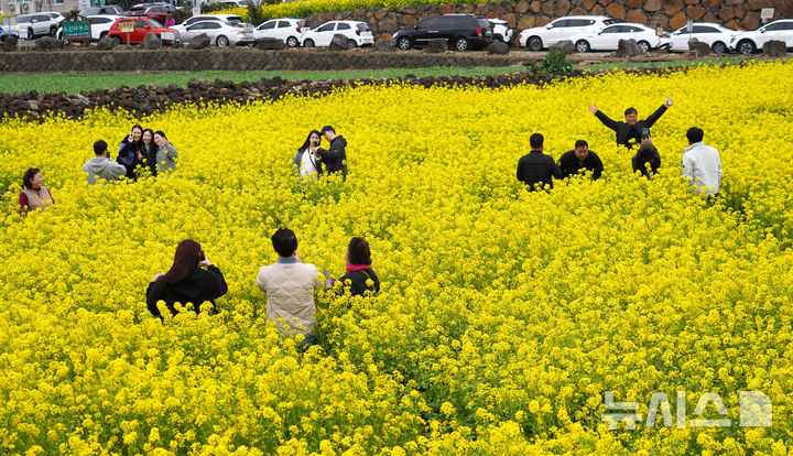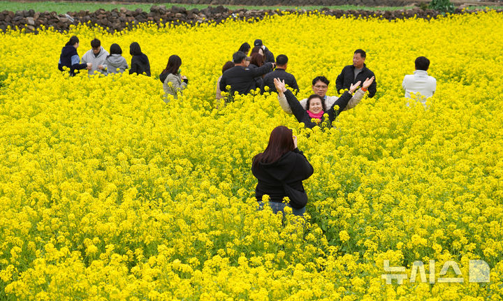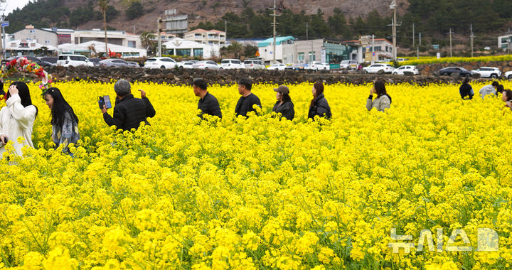 【NEWSIS】1日午後、済州特別自治道西帰浦市にある山房山のふもとで、済州島を訪れた観光客たちが、満開の菜の花畑を歩いて楽しいひとときを過ごした。