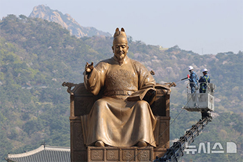「春到来」シャワー浴びる世宗大王像 /ソウル
