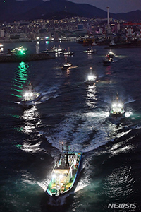 新年初操業のため出港した大型巻き網漁船100隻/釜山