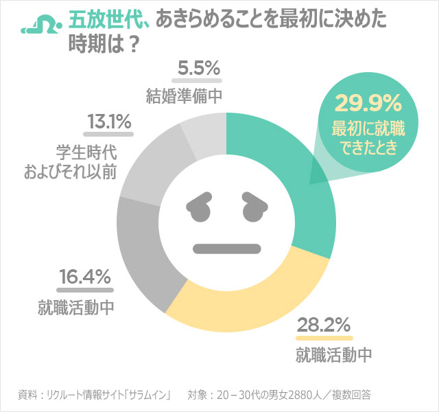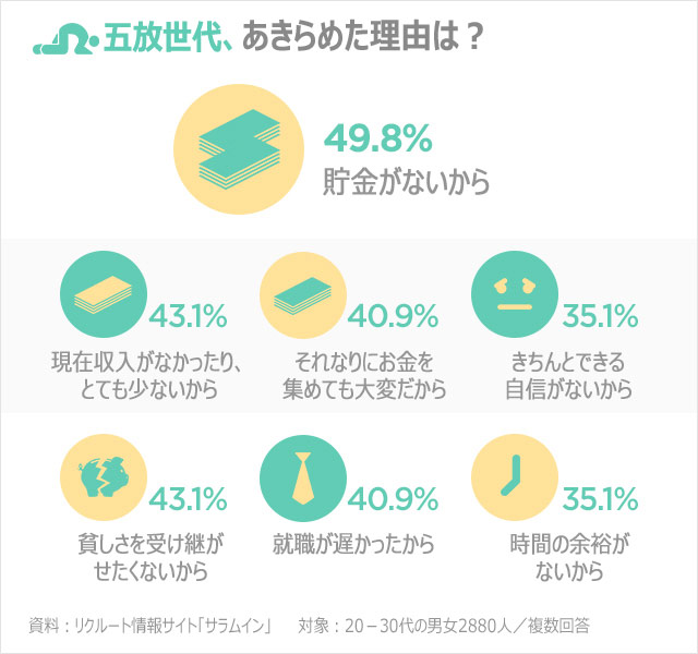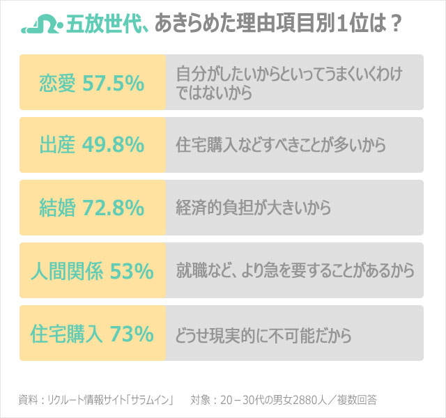 恋愛や結婚、出産だけでなく、住宅購入や人間関係もあきらめてしまう、いわゆる「5放世代」が増えている。リクルート情報サイト「サラムイン」が20-30代を対象に、これら五つのうち、何かあきらめたものがあるか尋ねたところ、2人に1人が「ある」と答えた。20-30代が置かれている現実を見てみよう。