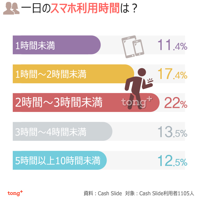 現代人にとって必需品と言えるスマートフォンの利用者が4000万人を超えた今、韓国のユーザーたちは一日にどれくらいスマートフォンを利用しているのか。「Cash Slide」が公開した資料によると、回答者全体の35.7%が一日4時間以上スマートフォンを利用しているという。それでは最もよく利用するアプリ、一日の利用時間などについて見てみよう。