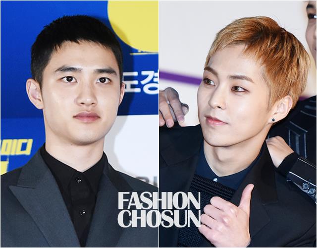 EXOのメンバーの中でも短いヘアスタイルを好むD.O.とシウミン。D.O.は黒髪のスポーツ刈り、シウミンはさまざまな髪色に変えながら、小顔をよりいっそう際立たせている。