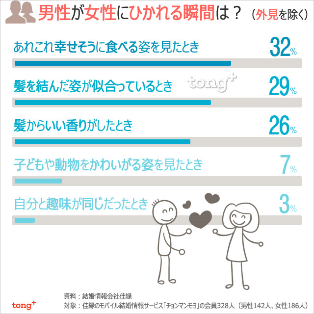 外見に関係なく、どんなとき異性にひかれるのだろうか。男性は、女性が「幸せそうに食べているとき」を1位に挙げた。そのほか、どんなときに胸がキュンとして心ひかれるのだろうか。未婚の男女が異性にひかれる瞬間を見てみよう。