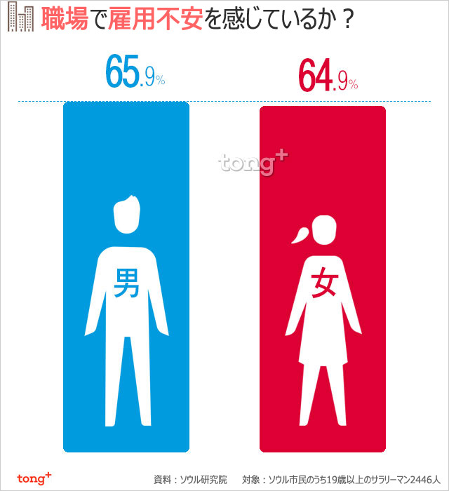 ソウルではサラリーマンの10人に6人以上が雇用不安を感じていることが分かった。また、仕事と家庭のどちらが大事か尋ねる質問では、回答者の55%が仕事優先と答えた。ますます厳しくなっている職場生活において、満足度はどの程度なのだろうか。労働環境に対する満足度など、ソウルのサラリーマンの職場生活について見てみよう。