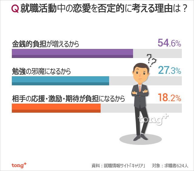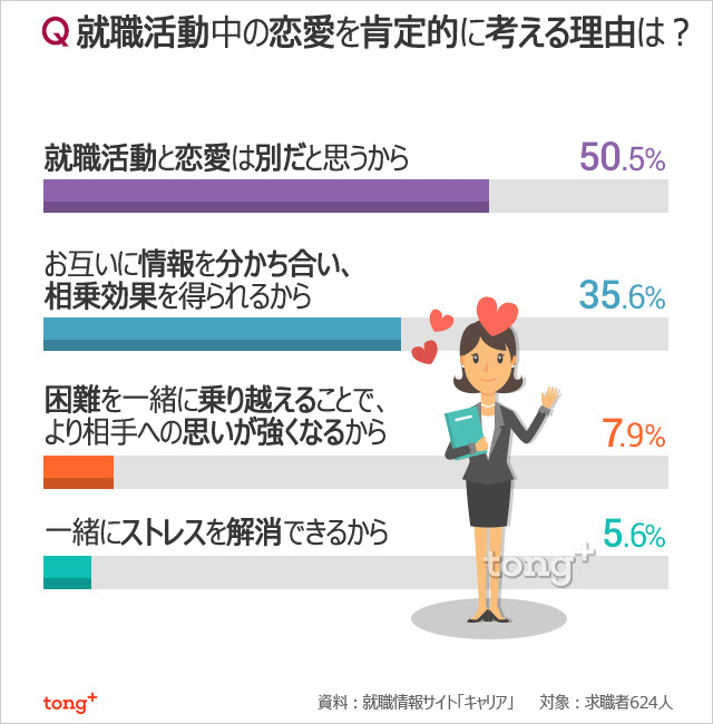 求職者10人のうち5人以上が、就職できたら別れた恋人に連絡する意向があることが分かった。再び連絡したいと思う理由としては「自分がうまくいった姿を見せ、後悔させたいから」という回答が43.6%で最も多かった。求職者による、就職活動中に恋愛することに対する考え、恋愛を肯定的・否定的に考える理由を見てみよう。