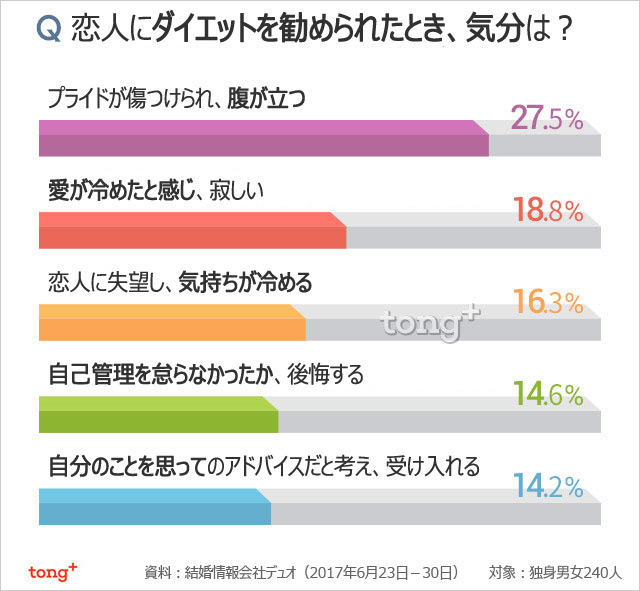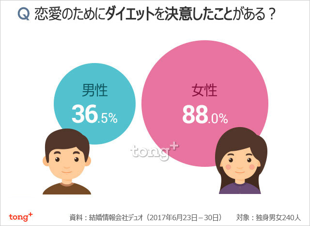 独身の男女10人のうち6人は、恋愛のためにダイエットを決意したことがあるという。特に、女性回答者の88.0%がダイエットを経験したことがあると答え、男性(36.5%)に比べ多いことが分かった。では、ダイエットを決意した時期、失敗の原因など、「恋愛とダイエット」をめぐるアンケート調査の結果を見てみよう。