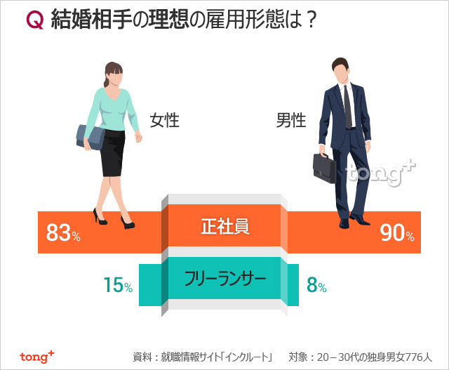 独身の男女が考える結婚相手の最低条件として、男性の場合、年収はおよそ3820万ウォン(約380万円)、公企業に勤めている女性を挙げた。一方女性の場合、結婚相手に求める最低年収はおよそ3690万ウォン(約370万円)で、職業は問わないと答えており、男女で温度差があることが分かった。では、男女が希望する結婚相手の年収、職業、雇用形態など各条件を見てみよう。