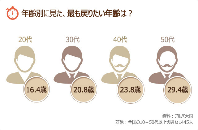 韓国人の10人に8人は現在、成功した人生を歩んでいないと考えていることが分かった。また、戻りたい過去があるかという質問には、65%が「ある」と答えた。20代-50代がそれぞれ何歳に戻りたいと考えているのか、アルバイト情報サイト「アルバ天国」による調査の結果を見てみよう。