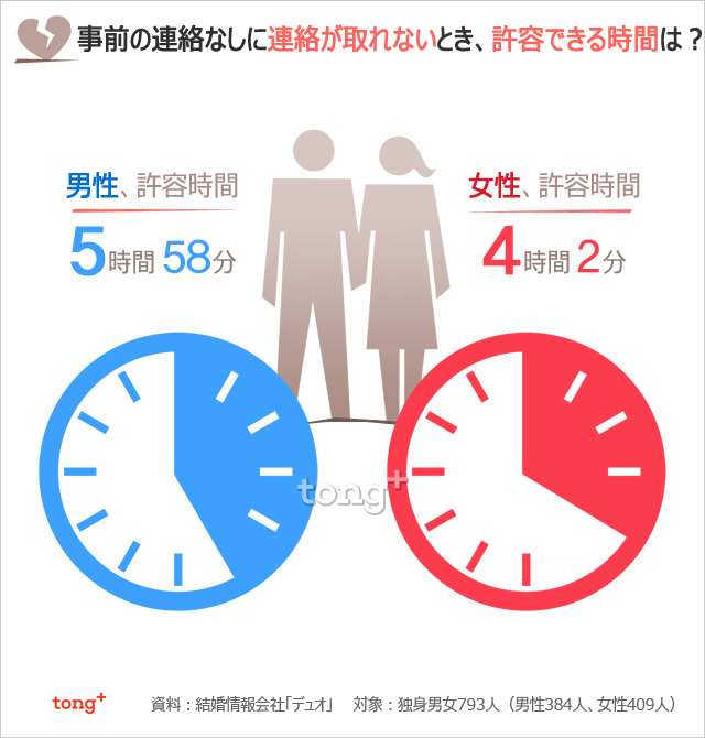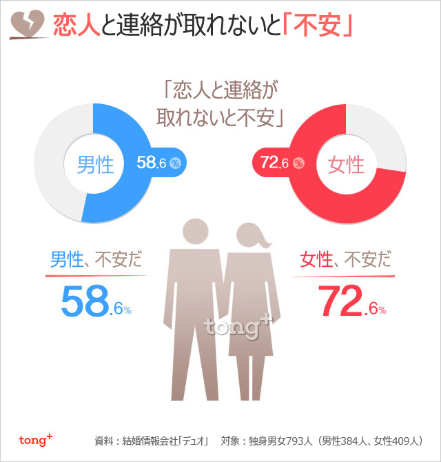 恋人と連絡が取れないとき、独身男性の58.6%、独身女性の72.6%が「不安になる」と答えた。では、連絡がつかないとき、どんな反応を見せるのだろうか。男女それぞれ異なる反応、連絡がつかない場合に許せる時間をまとめてみた。