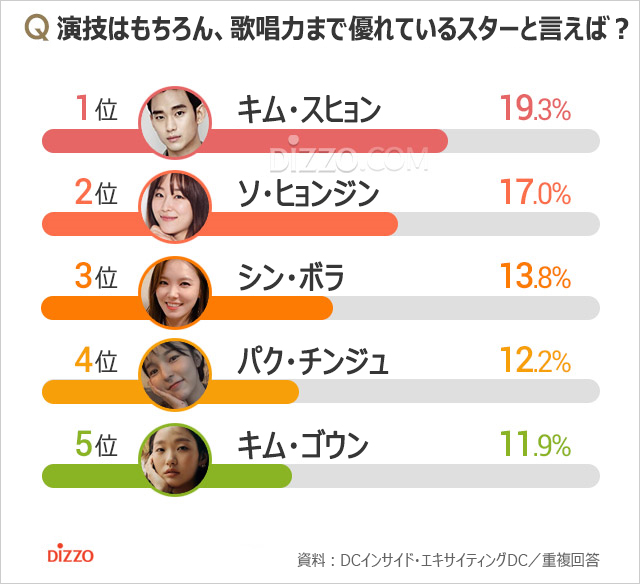 コミュニティー・ポータルサイト「DCインサイド」と検索サイトを手掛けるマイ・セレブズが運営している「エキサイティングDC」が「歌手よりうまい! 演技のほか歌唱力まで優れているスター」をテーマに実施したオンライン投票の結果を見てみよう。