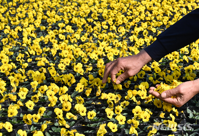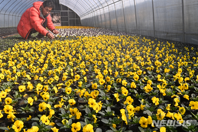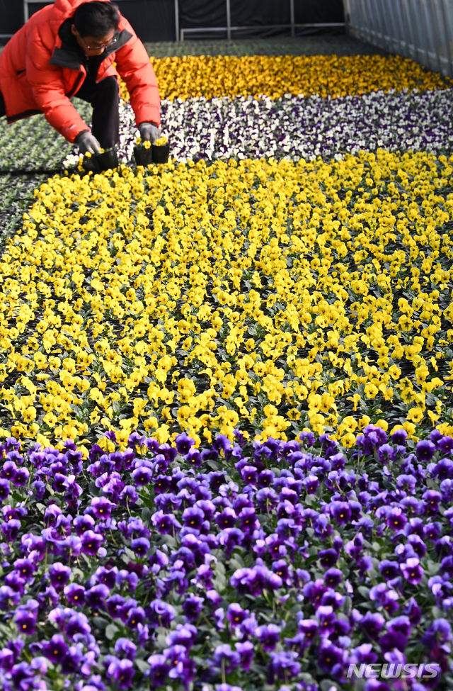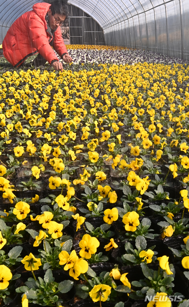 二十四節気の始まりに当たる立春があすに迫った2日午後、京畿道華城市梅松面のある農園では、出荷を前に従業員がパンジーの花を抜き取っていた。