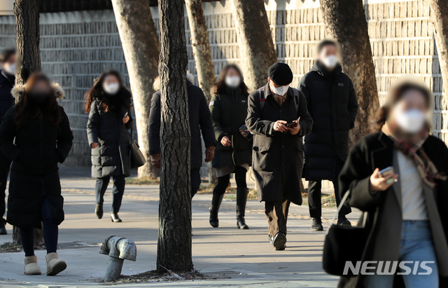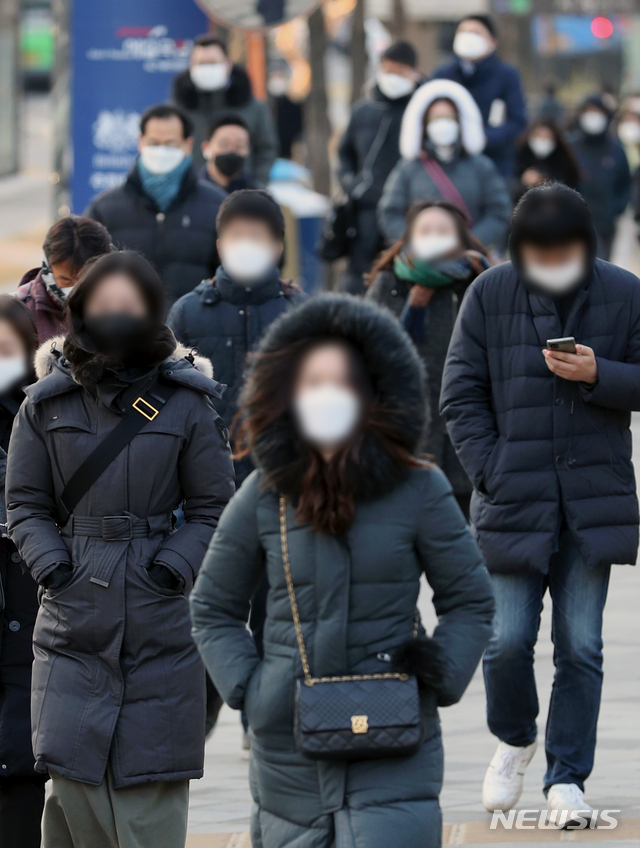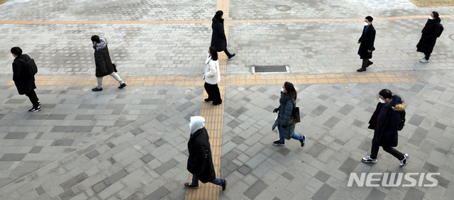【NEWSIS】二十四節気で春の気配が始まるとされる「立春」ながらも冷え込んだ3日午前、ソウル市庁駅を出勤のために歩く人々。