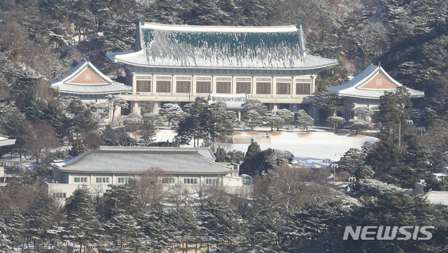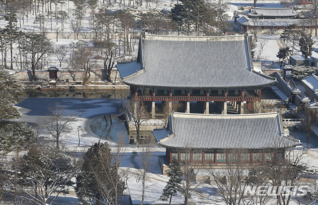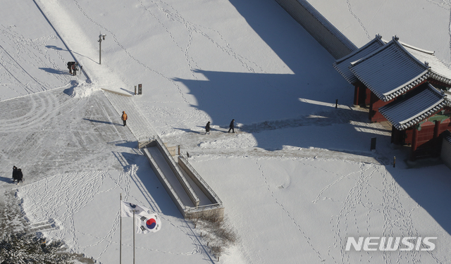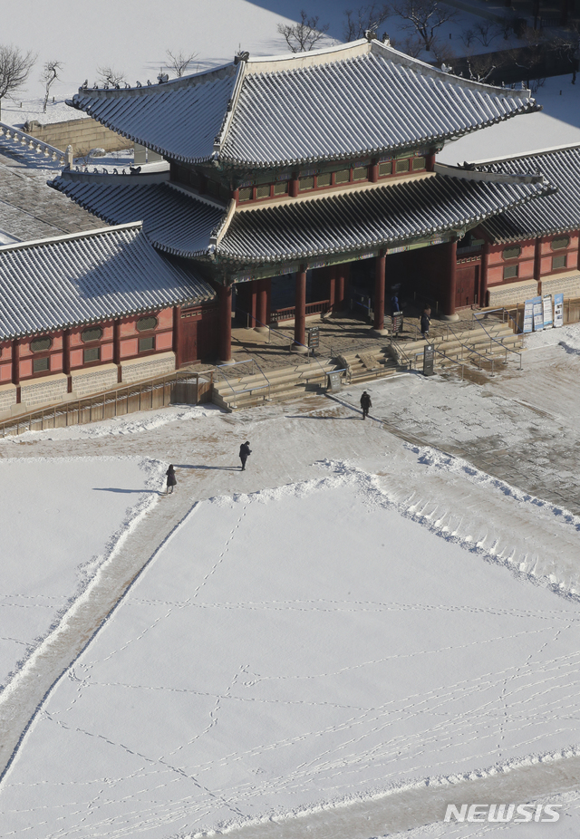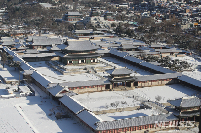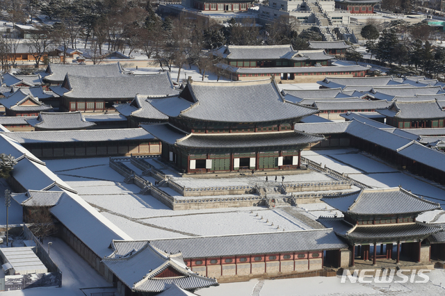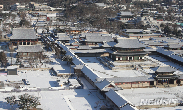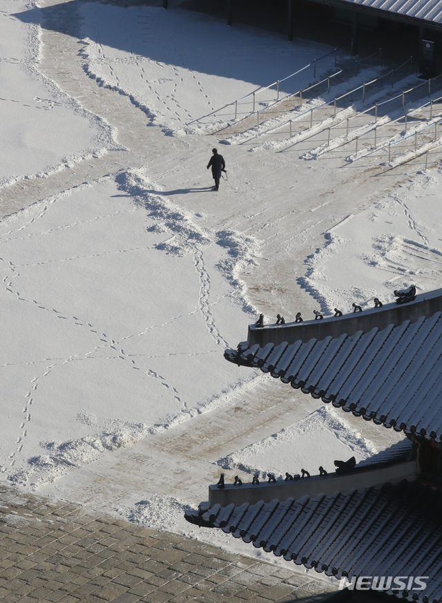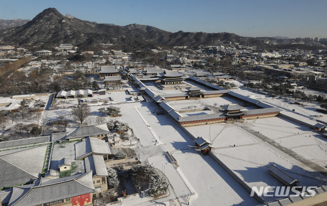 【NEWSIS】ソウルをはじめとする北部地域に前日夕から降った雪がやんだ4日午前、ソウル市鍾路区の景福宮も白一色になっていた。気象庁は午後から気温が上昇し、今週末までは大幅に気温が下がることはないという予報を出した。
