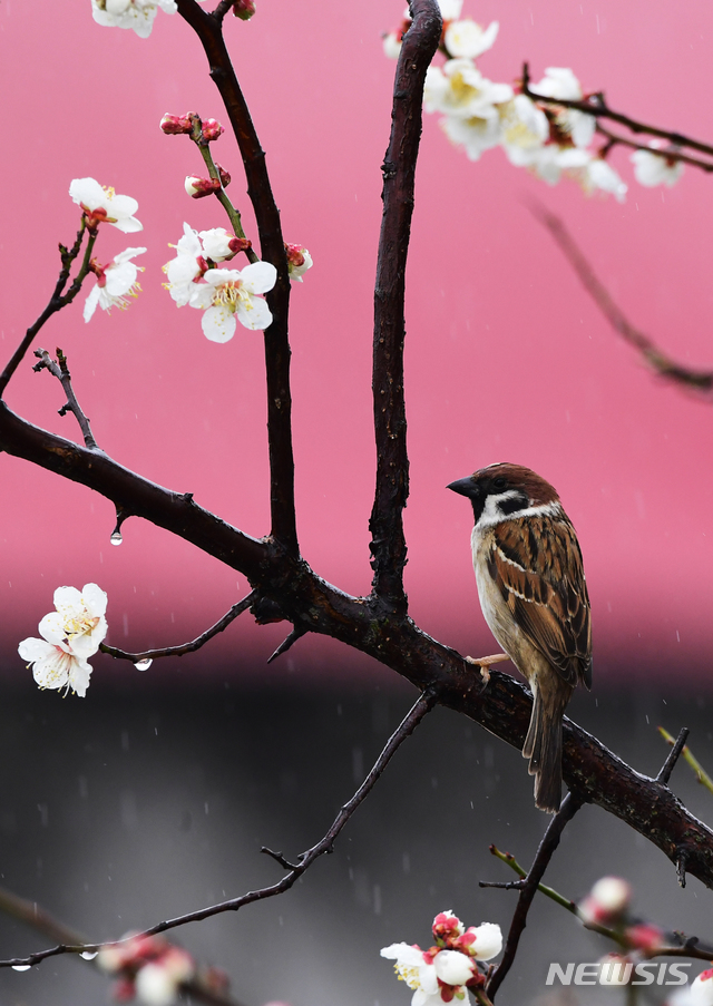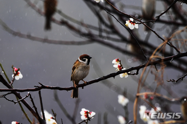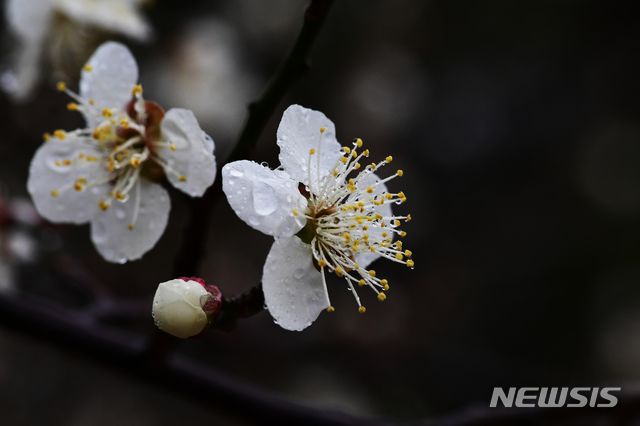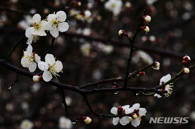 春を催促する雨が降った1日午後、慶尚南道南海郡ソルチョン里では、大きく咲いたウメの花に雨粒がしとしとと降りかかっていた。