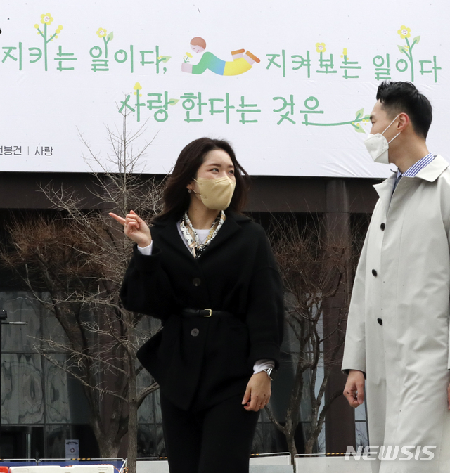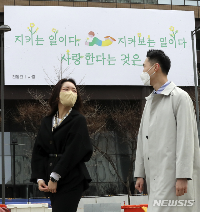 ソウル市鍾路区の教保生命ビルの外壁に2日午前、「春編」として詩人・全鳳健(チョン・ボンゴン)の作品『愛』が掲げられていた。