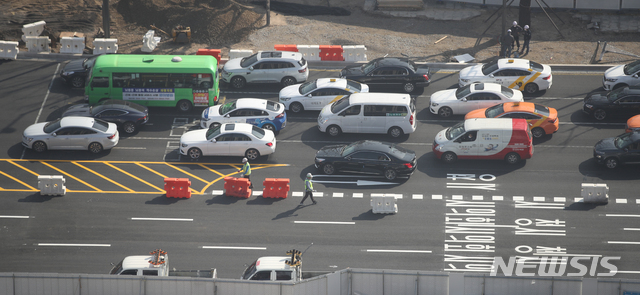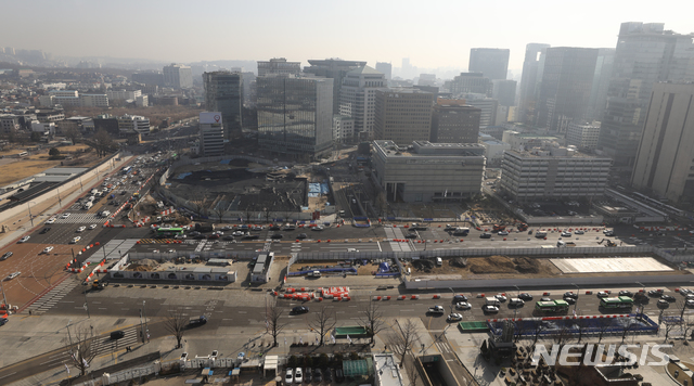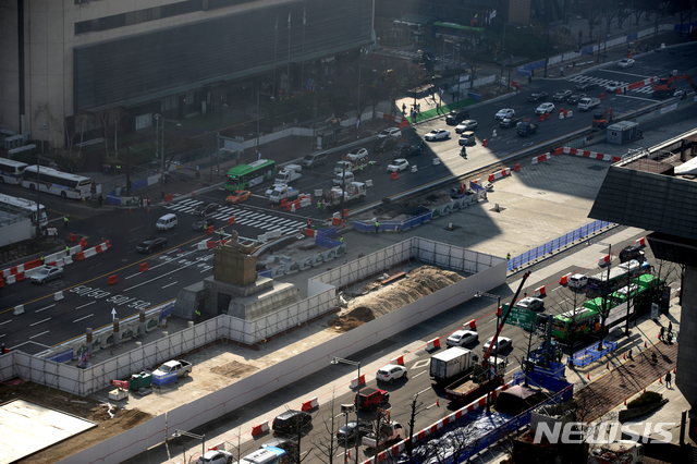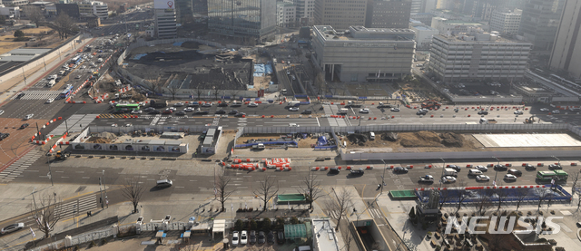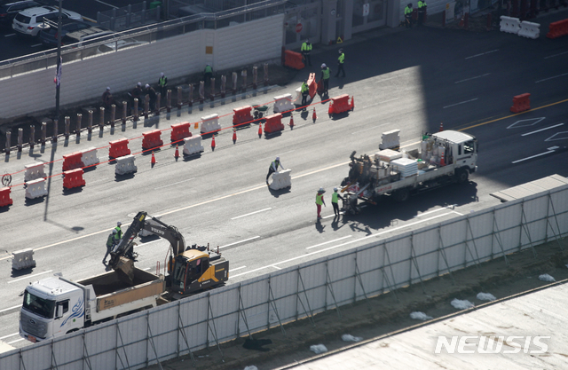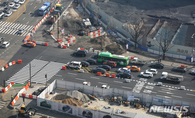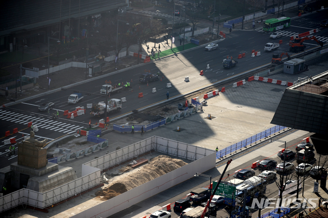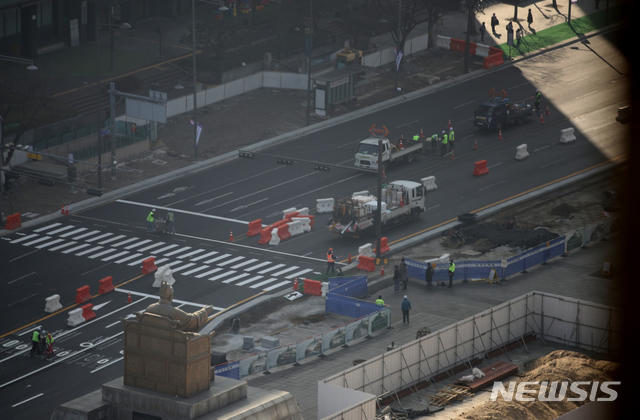 ソウル市が光化門広場の再構造化計画により、6日から広場の西側の車道を閉鎖することが決まっている中、5日に関連工事が行われていた。