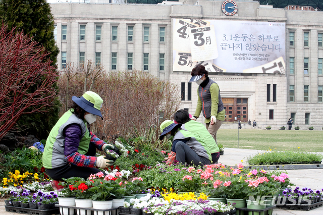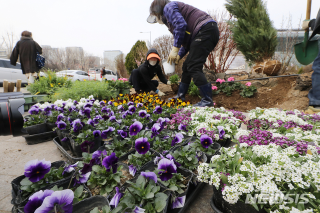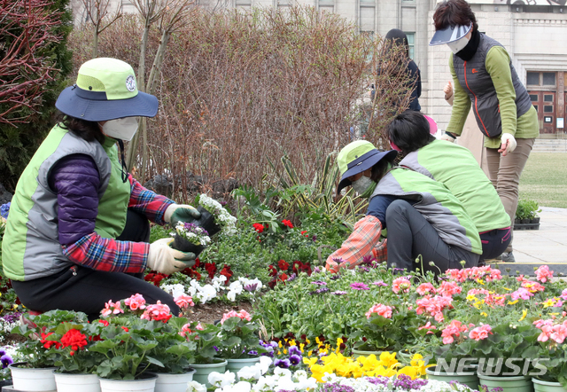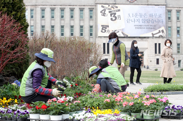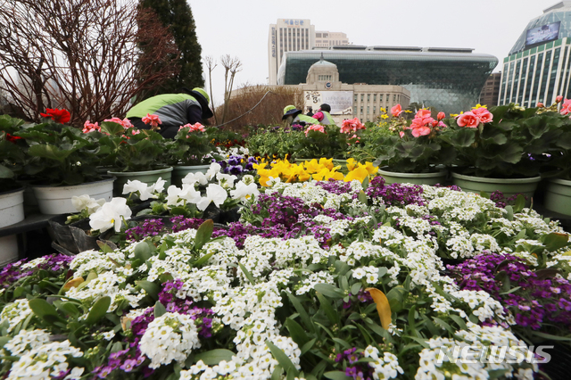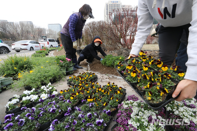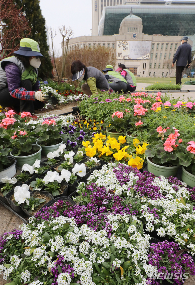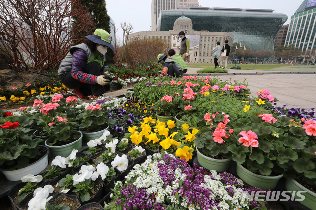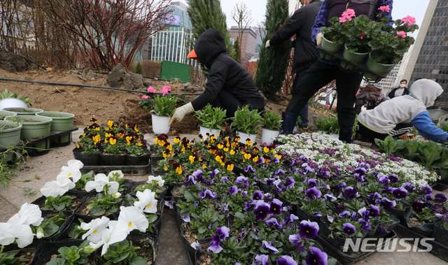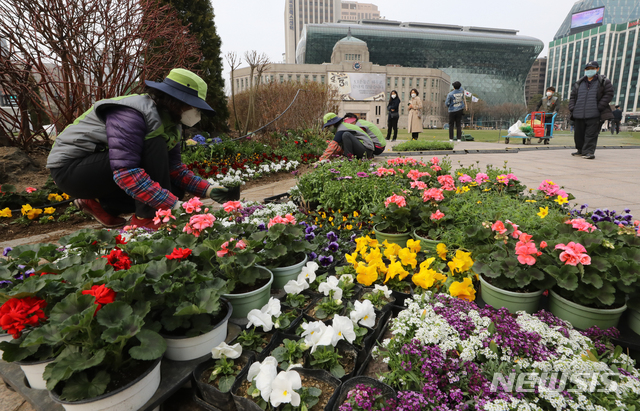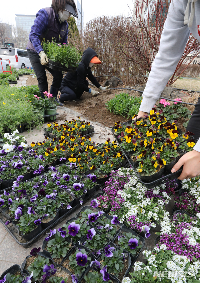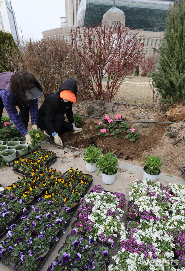 ソウル市の関係者が13日、市民の「コロナブルー」を慰労しようと、中区のソウル広場で街路花壇に春の花の植栽を行っているところ。