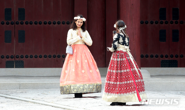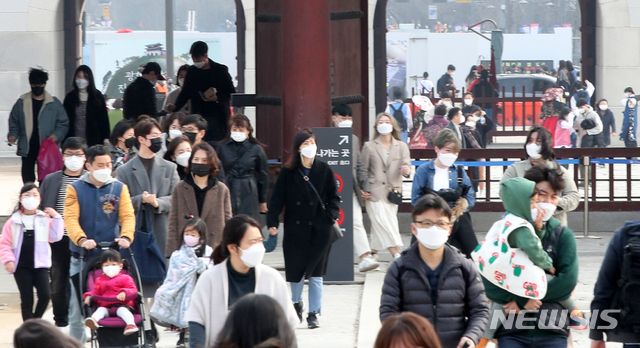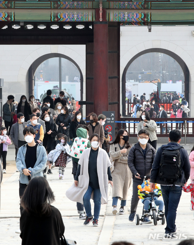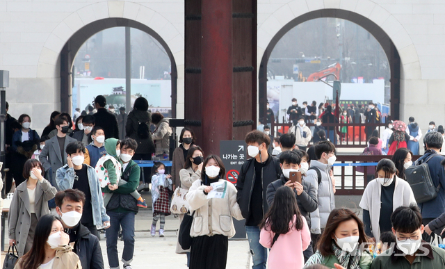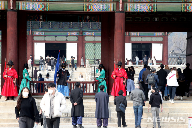 韓国の防疫当局がソーシャルディスタンスを2週間延長する中、ソウル市鍾路区の景福宮では13日、大勢の市民が休日を楽しんだ。