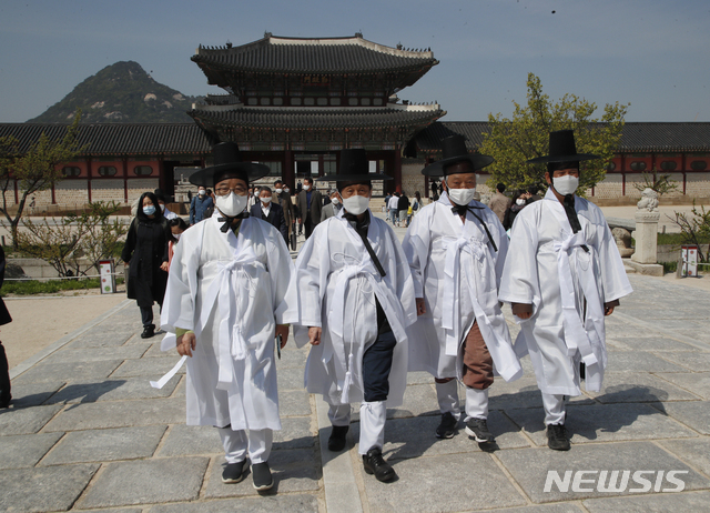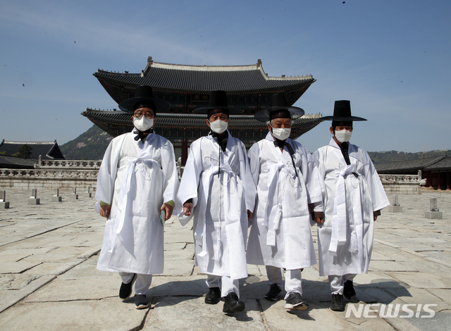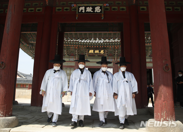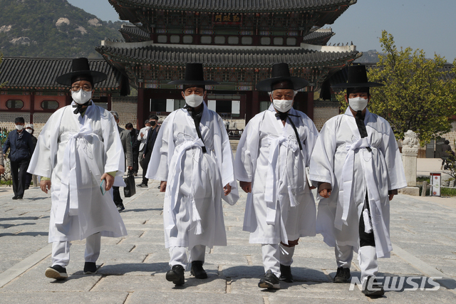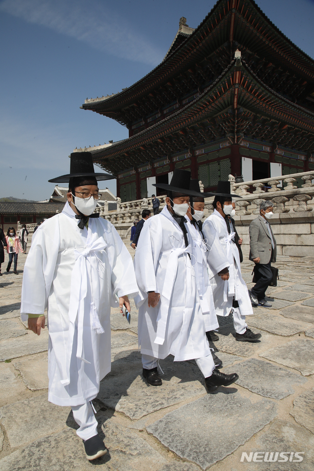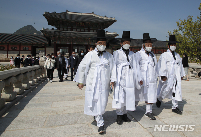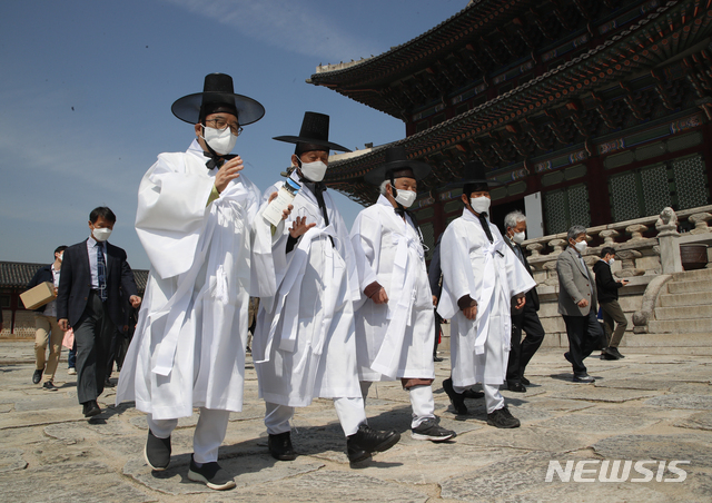 ソウル市鍾路区の景福宮で15日午後、「第2回退渓先生帰郷の道 再現歩行」(陶山書院および陶山書院ソンビ文化院の主催)の出発イベントが開かれた。写真は、帰郷の道再現団が景福宮を出発するところ。一行は安東の陶山書院まで270キロの道のりを一日平均20キロずつ、今月28日まで2週間かけて交代で歩く予定だ。