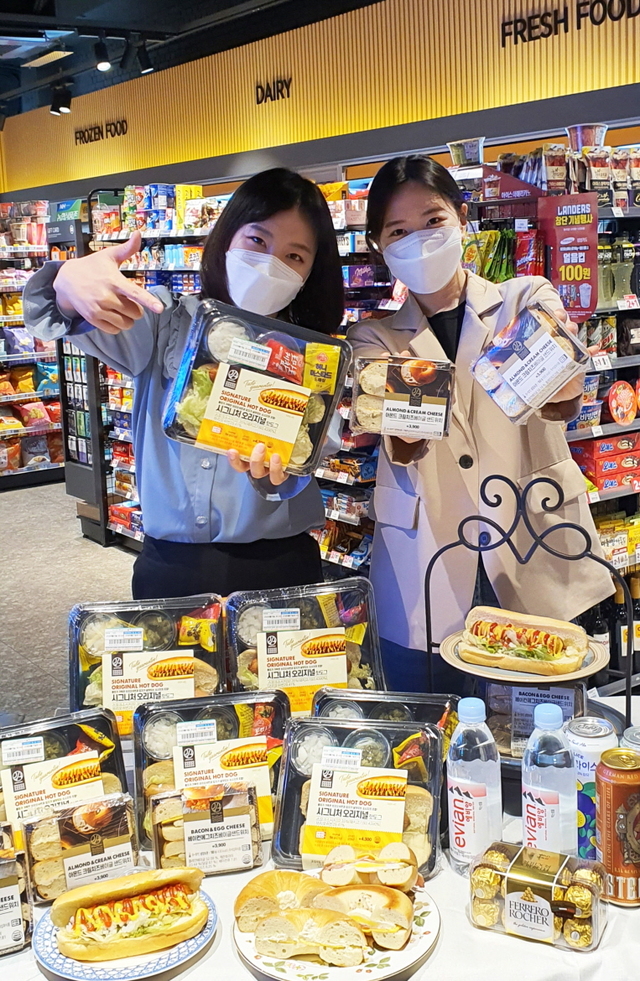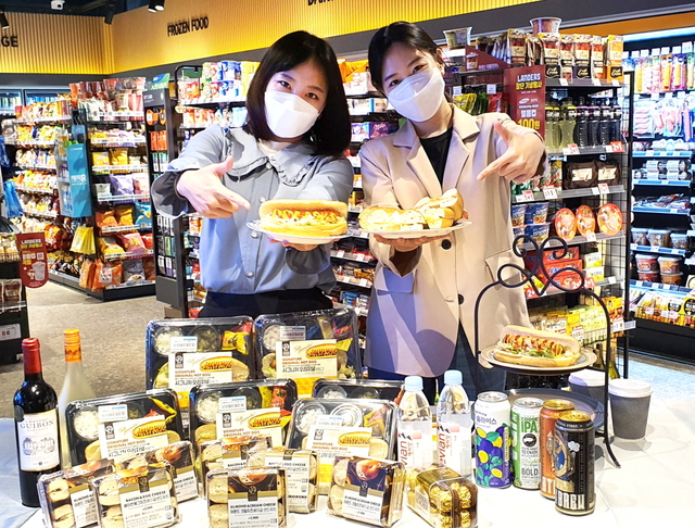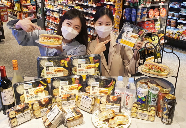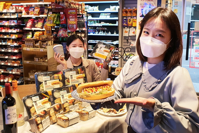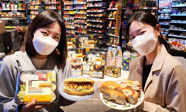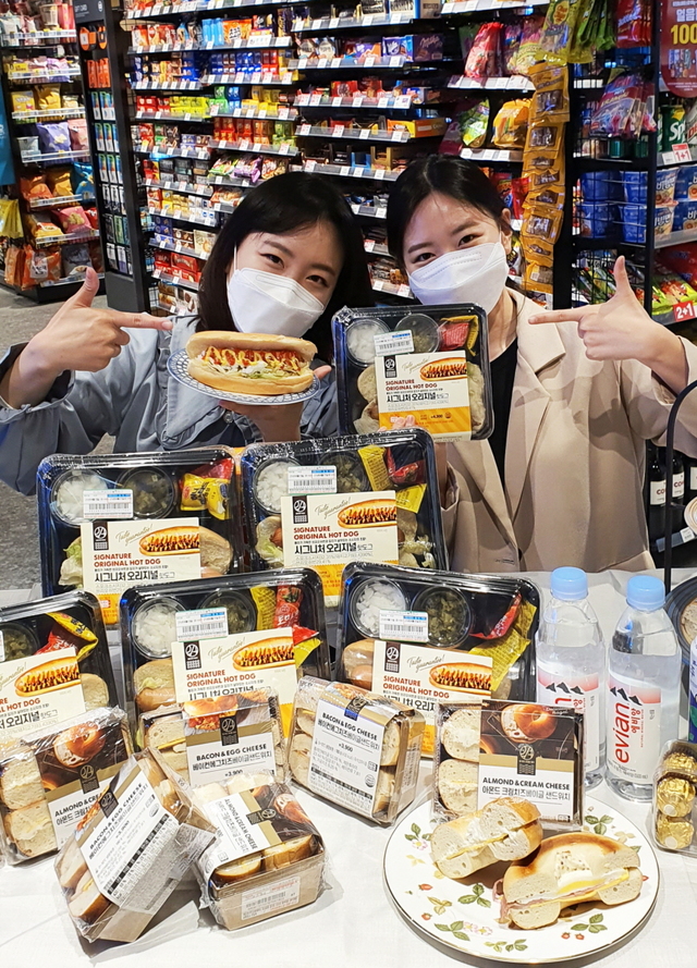 【NEWSIS】18日、ソウル市城東区のコンビニエンスストア「Eマート24」聖水大宇店で、プレミアム食事代用パン「シグネチャー・オリジナル・ホットドッグ」と「ベーグル・サンドイッチ」2種のPRが行われた。