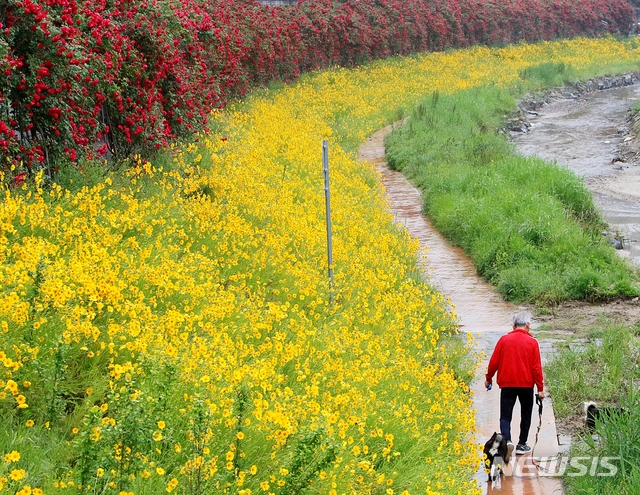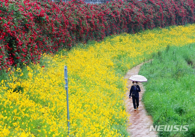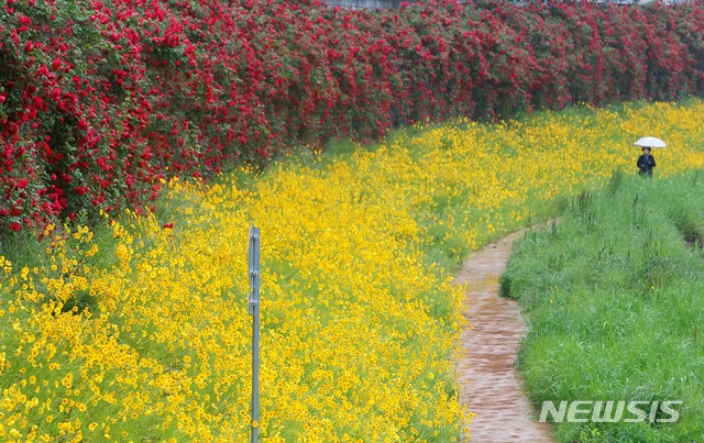 雨天となった20日、忠清北道清州市上党区の川べりで、満開となったバラとキンケイギクの間を歩く市民。