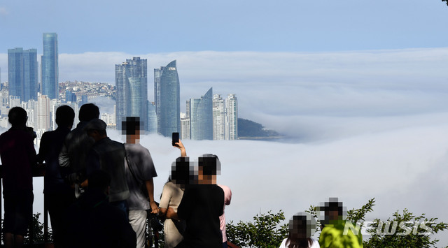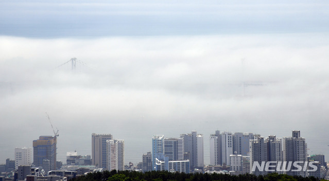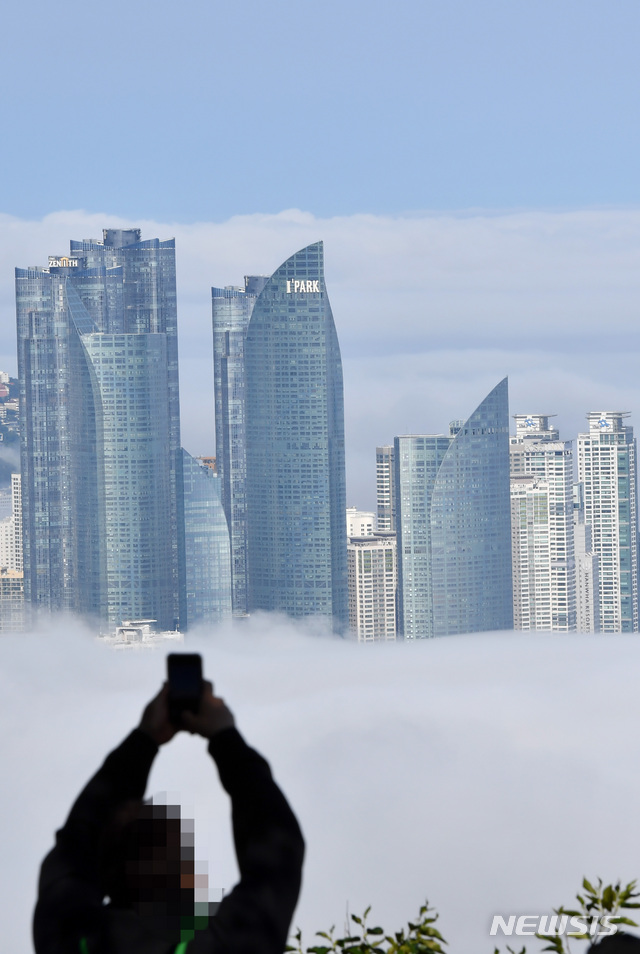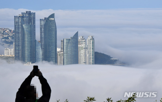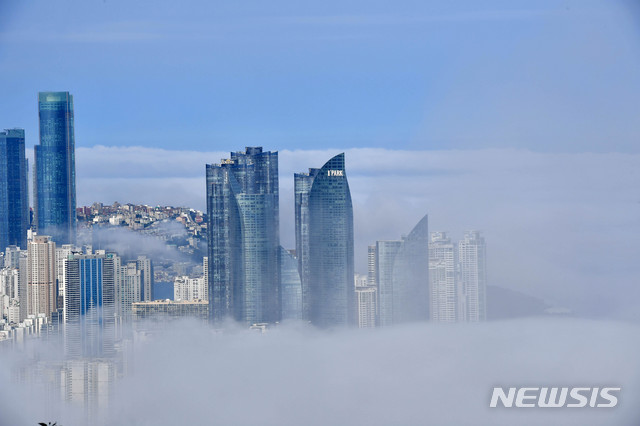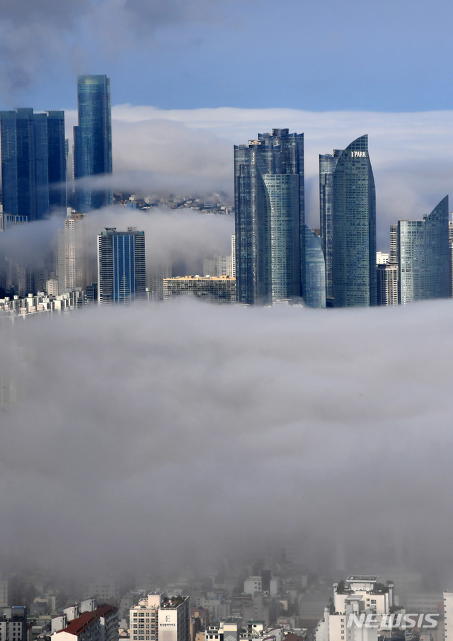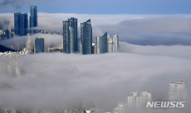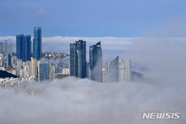 【NEWSIS】13日、釜山市海雲台区のマリンシティと広安大橋一帯に濃い海霧が流れ込み、まるで雲の上にビル群が浮かんでいるような壮観を成した。