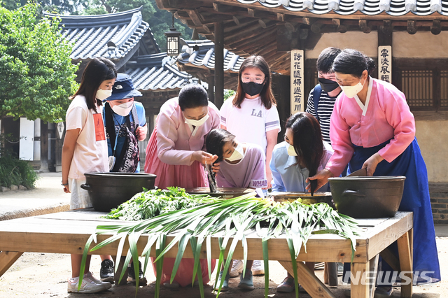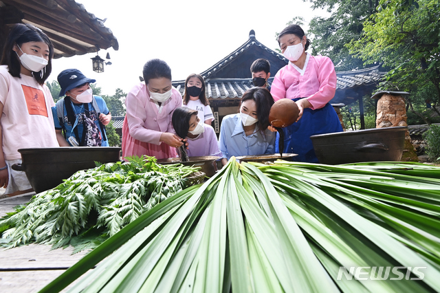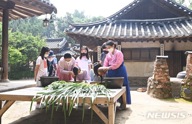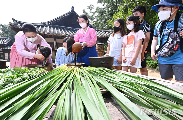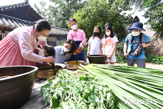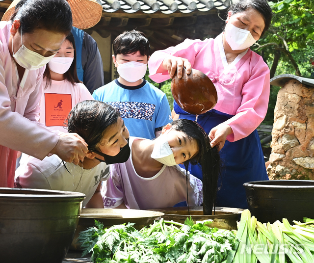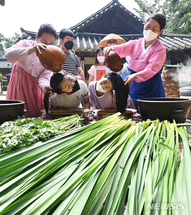 【NEWSIS】端午(旧暦5月5日、今年は6月14日)前日の13日午前、京畿道竜仁市内の韓国民俗村で、伝統にのっとりしょうぶ湯で髪を洗う伝統行事体験の参加者たち。