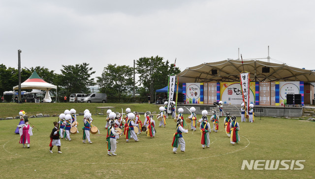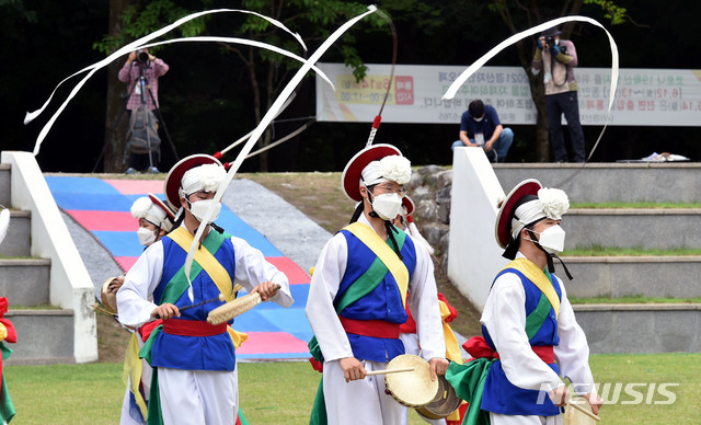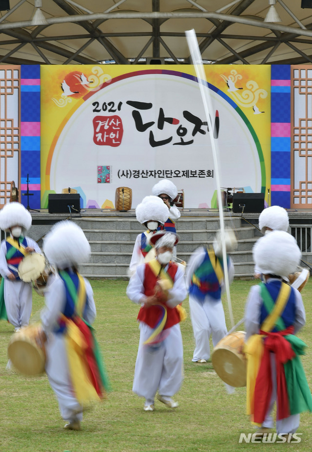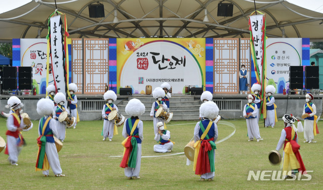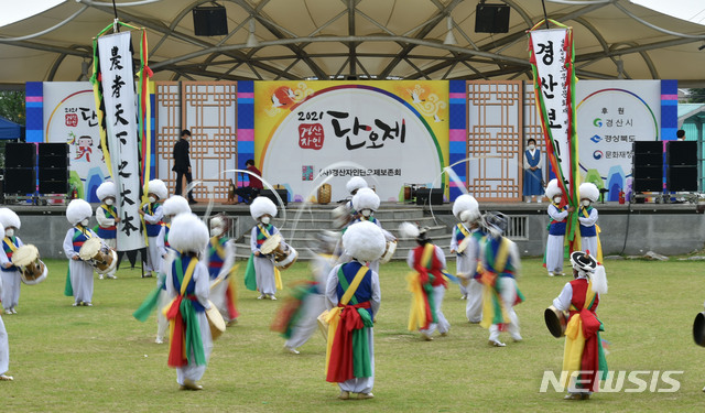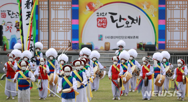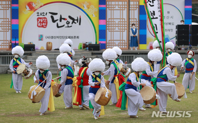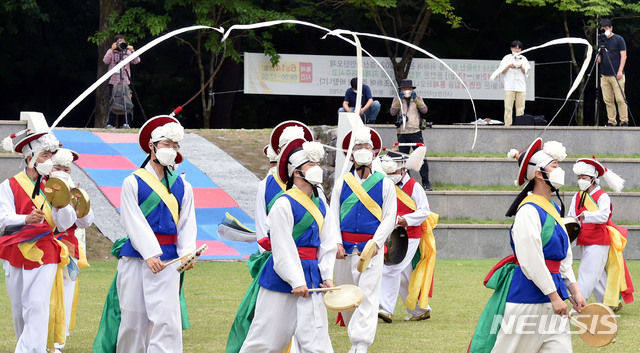 「オンライン2021慶山慈仁端午祭」が14日、慶尚北道慶山市慈仁面桂亭の「端午広場」で開かれた。写真は、慶北無形文化財第41号「輔仁農楽」の公演が行われているところ。