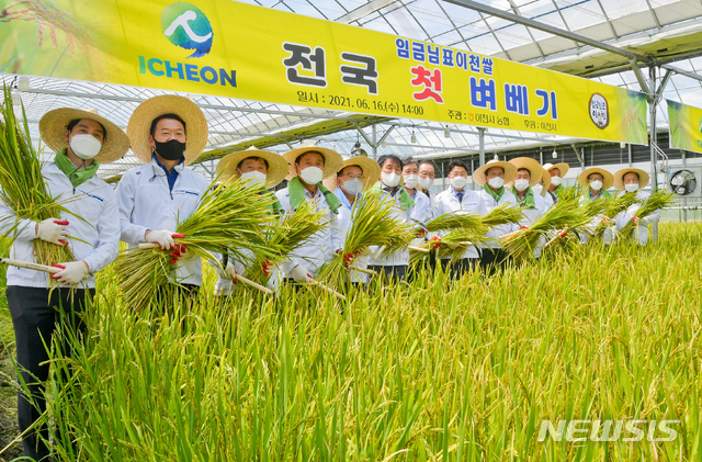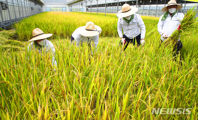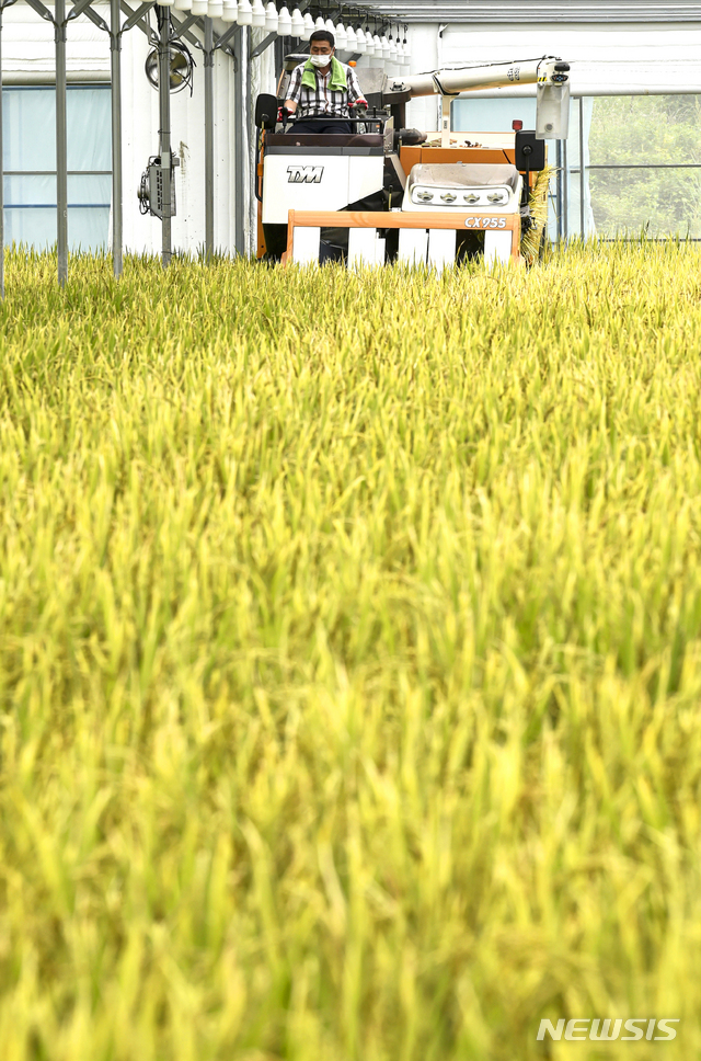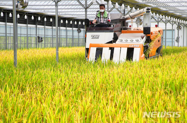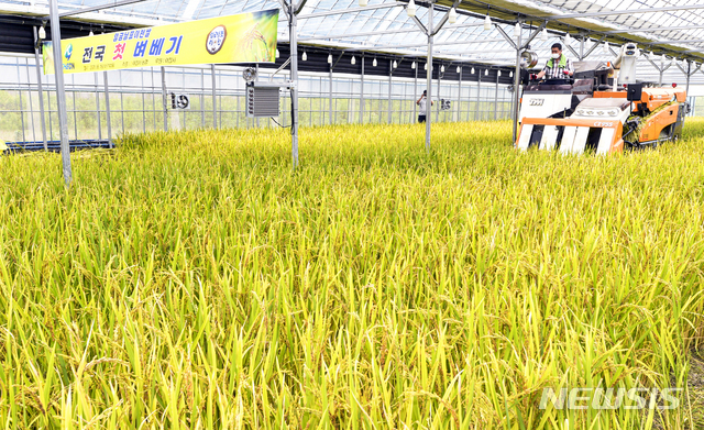 京畿道利川市戸法面のビニールハウス水田で16日午前、「王様印の利川米 全国初の稲刈り」イベントが開かれ、農家の人々がコンバインを使ってイネの収穫を行っている。