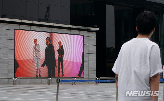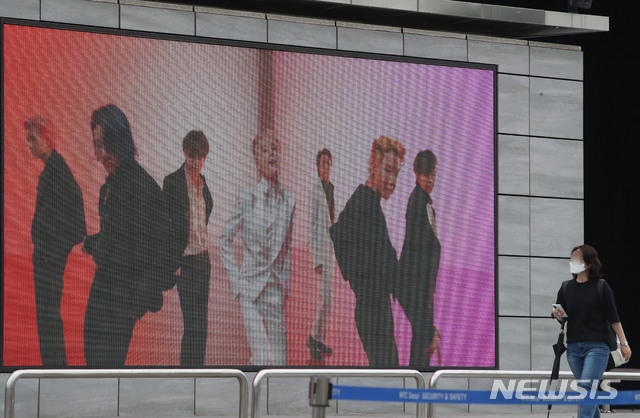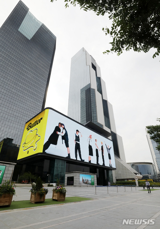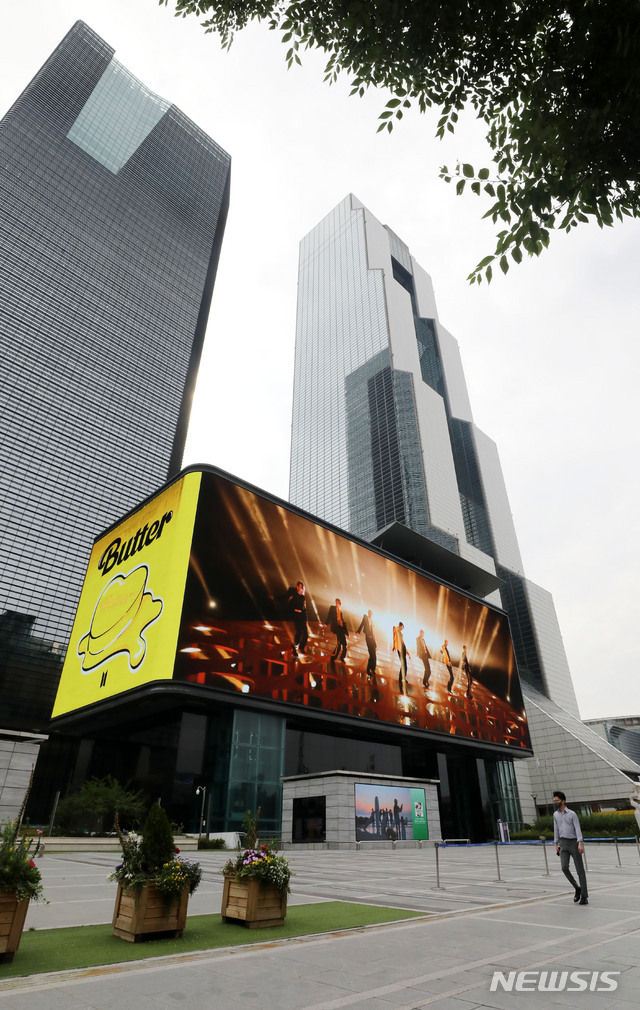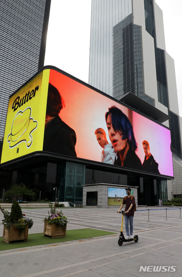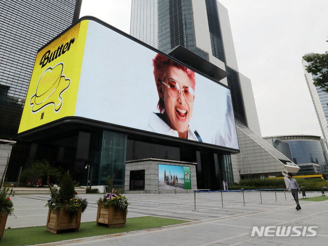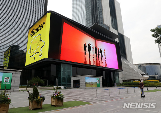 ソウル市江南区のCOEX前の電光掲示板には15日午後、防弾少年団(BTS)の新曲「Butter」のミュージックビデオが映し出されていた。防弾少年団は「Butter」で米ビルボード・シングル・チャート「Hot100」で3週連続1位をキープし、新記録を打ち立てた。