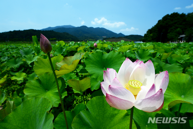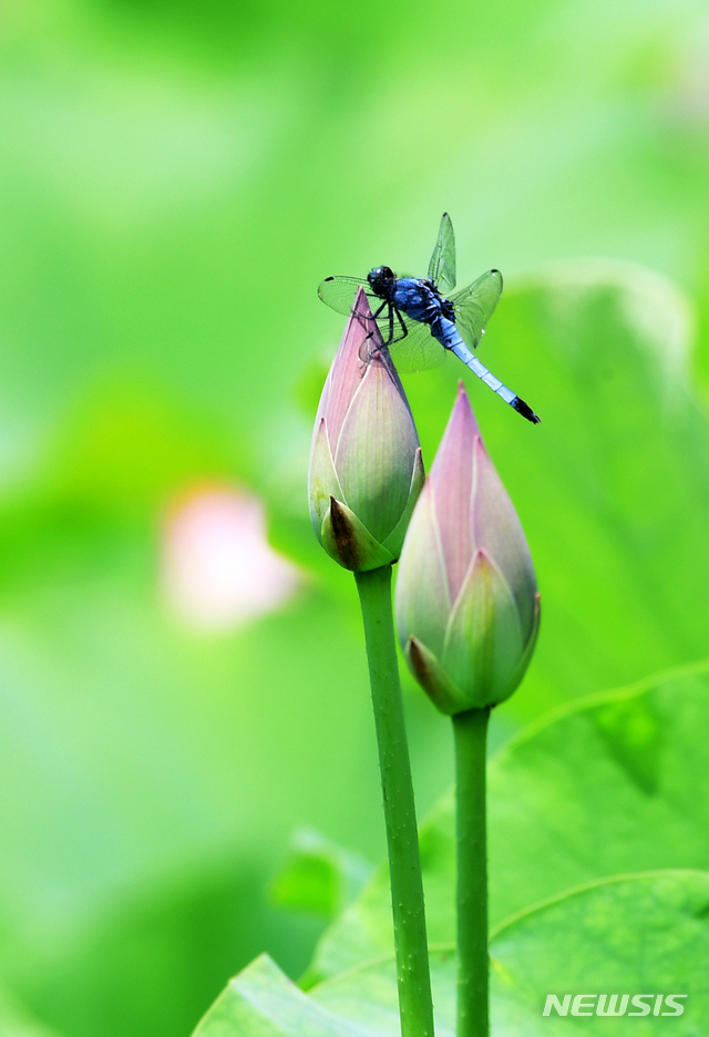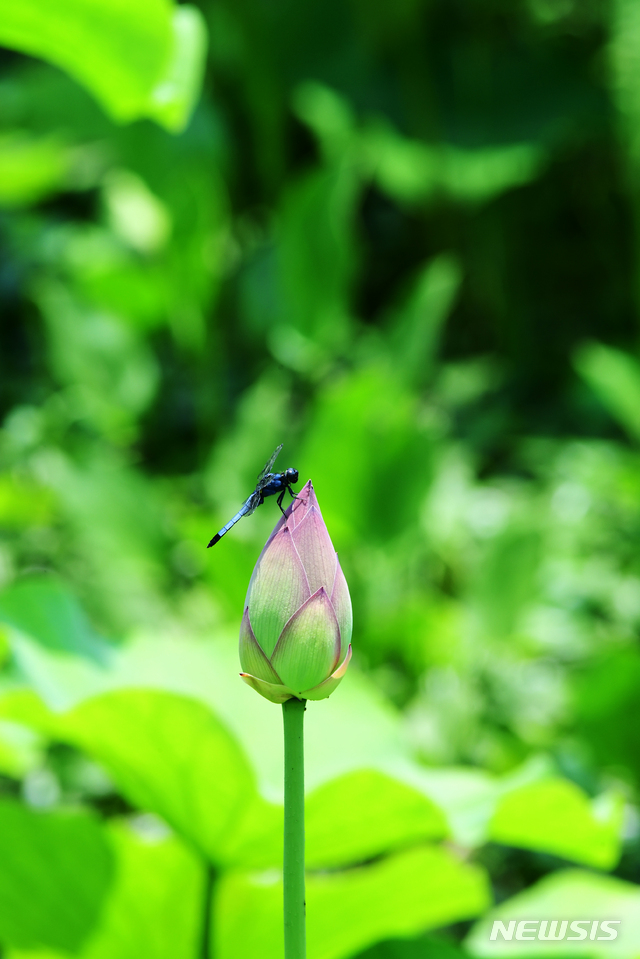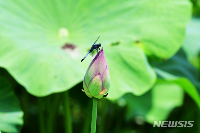 【NEWSIS】27日午後、慶尚南道河東郡のハス畑で、つぼみにトンボが1匹、とまっていた。