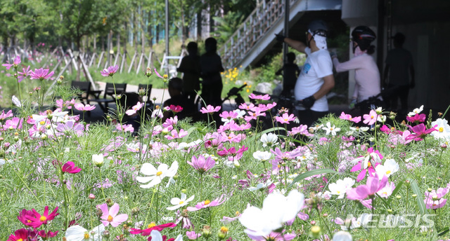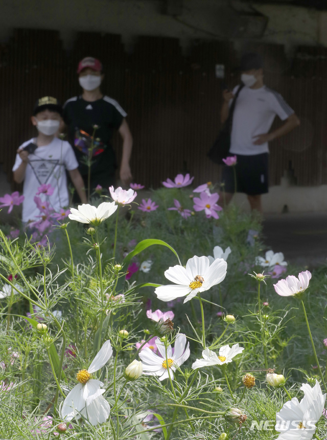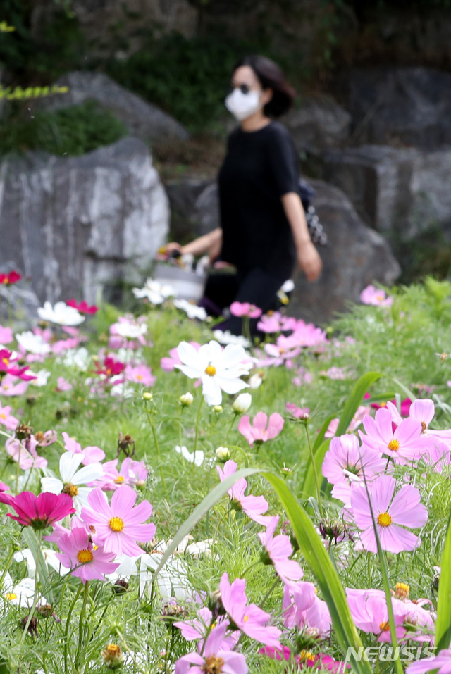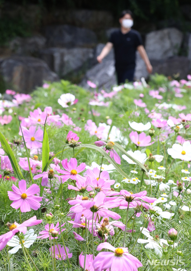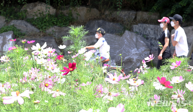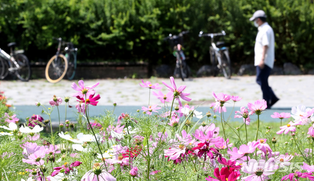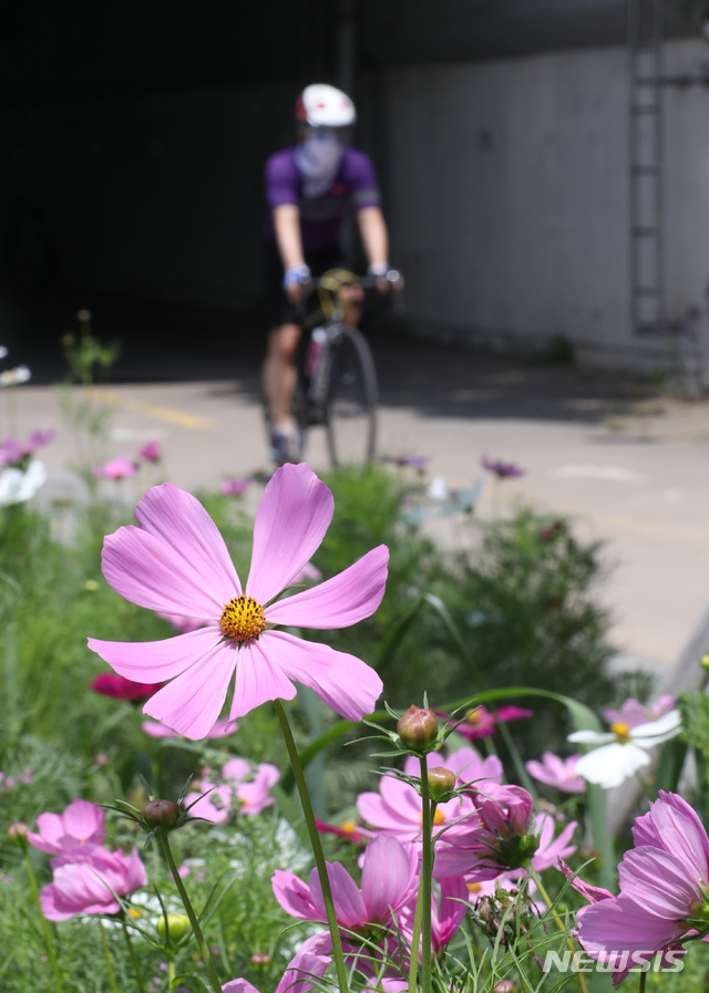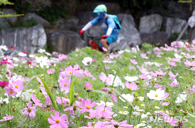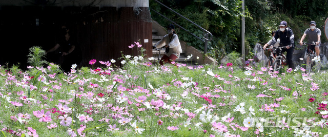 【NEWSIS】30℃前後の気温になるとの予報が出た27日午前、ソウル市松坡区内の城内川沿いにコスモスが咲いていた。